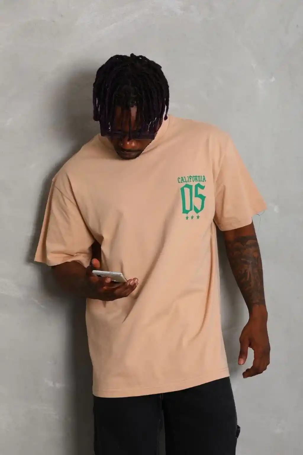 Unisex Oversize Baskılı Bisiklet Yaka T-Shirt - Bej
