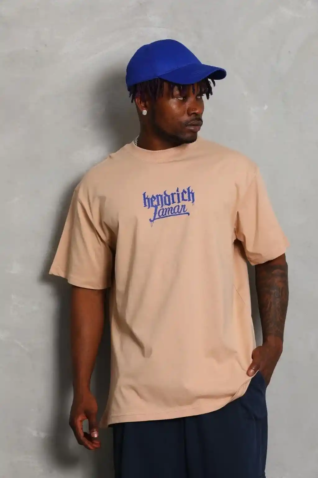 Unisex Oversize Baskılı Bisiklet Yaka T-Shirt - Bej