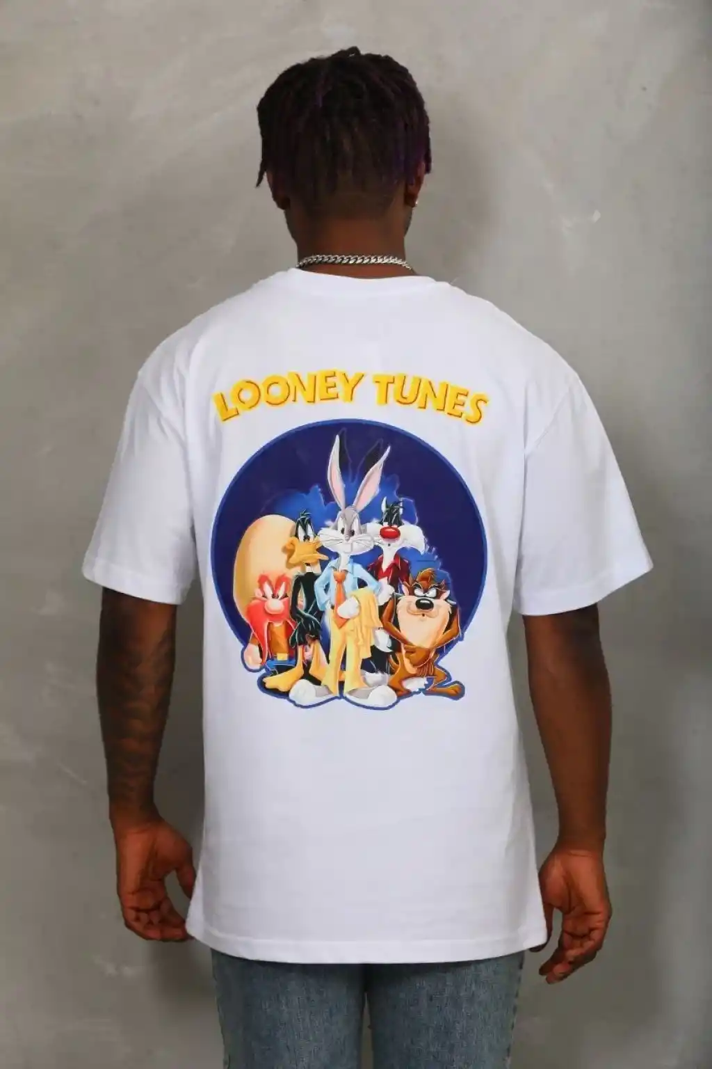 Unisex Oversize Baskılı Bisiklet Yaka T-Shirt - Beyaz