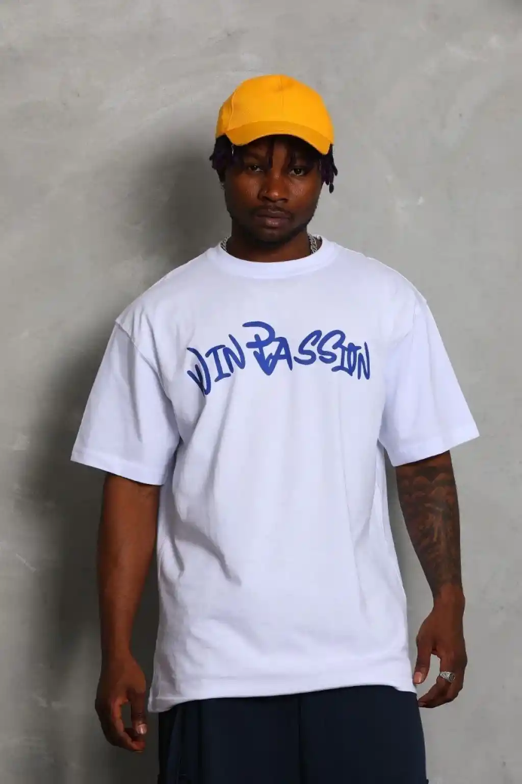 Erkek OversizeGrafik Tişört "CAMPBRASTCOOPERATION" Kalın Yazı Bisiklet Yaka, Kısa Kol, Kalın Mor ve Siyah Desenli Yazlık Sokak Kıyafeti - Beyaz
