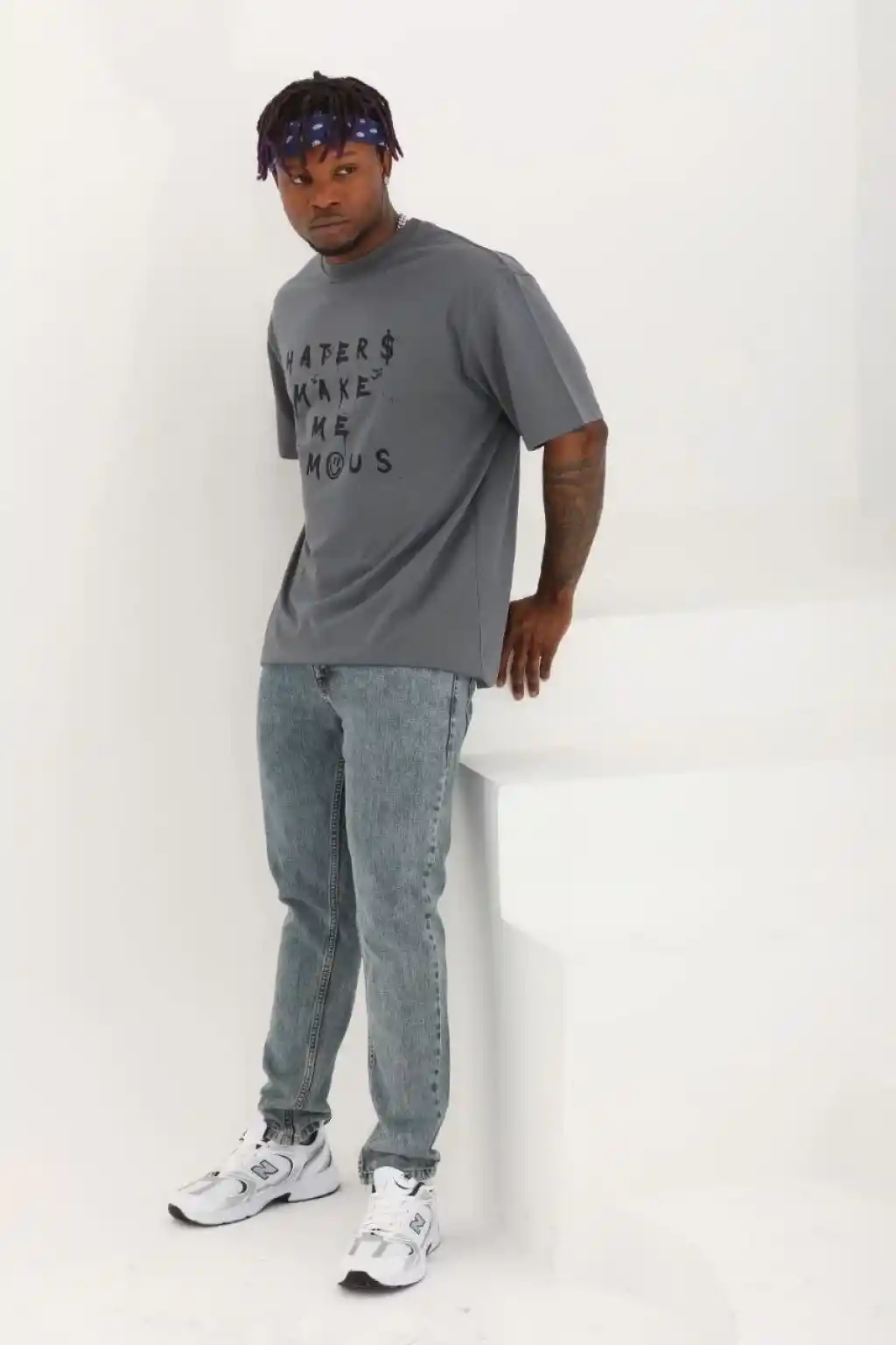 Unisex Oversize Baskılı Bisiklet Yaka T-Shirt - Füme