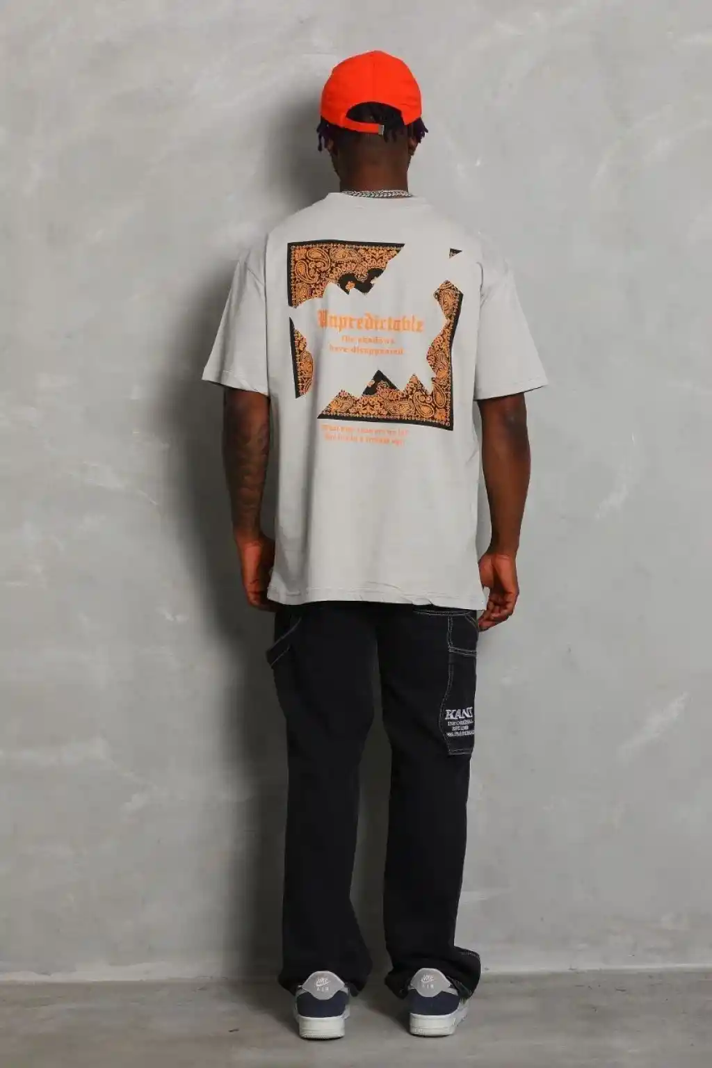 Unisex Oversize Baskılı Bisiklet Yaka T-Shirt - Gri