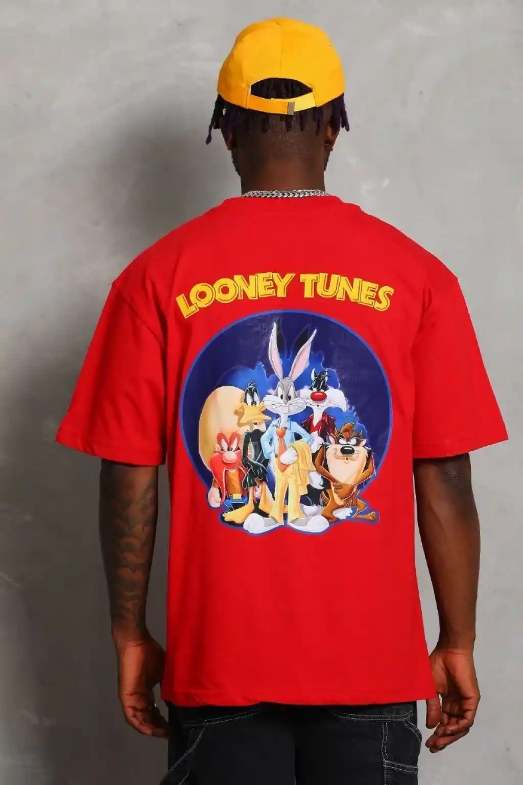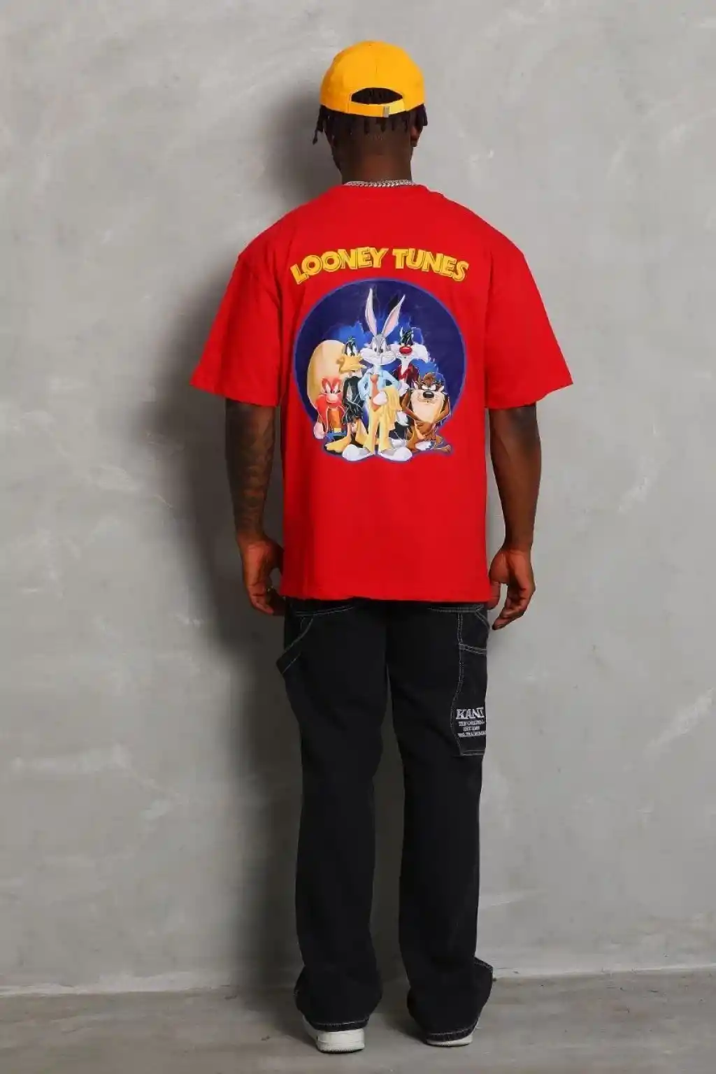 Unisex Oversize Baskılı Bisiklet Yaka T-Shirt - Kırmızı