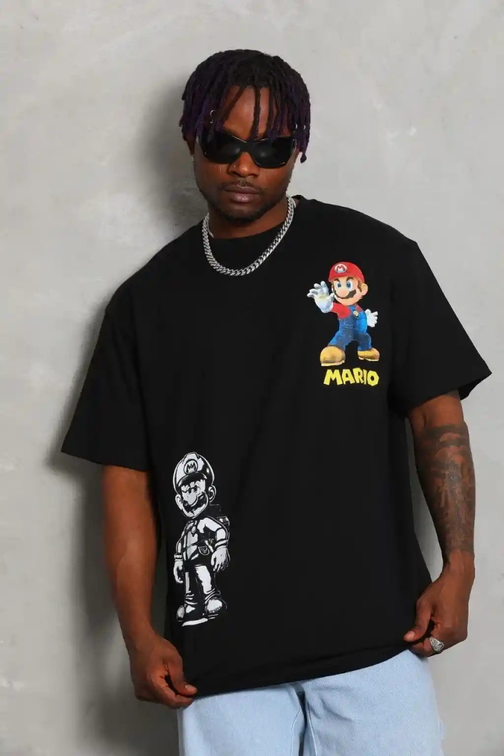 Unisex Oversize Baskılı Bisiklet Yaka T-Shirt - Siyah