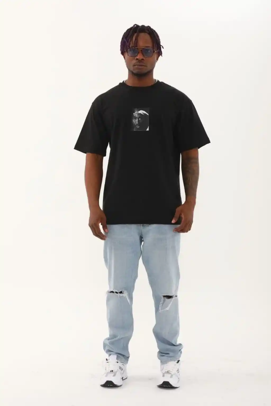 Unisex Oversize Baskılı Bisiklet Yaka T-Shirt - Siyah