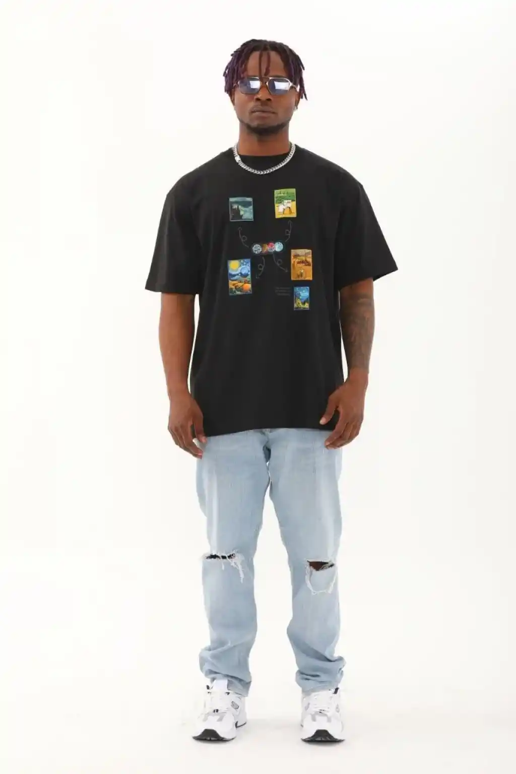 Unisex Oversize Baskılı Bisiklet Yaka T-Shirt - Siyah