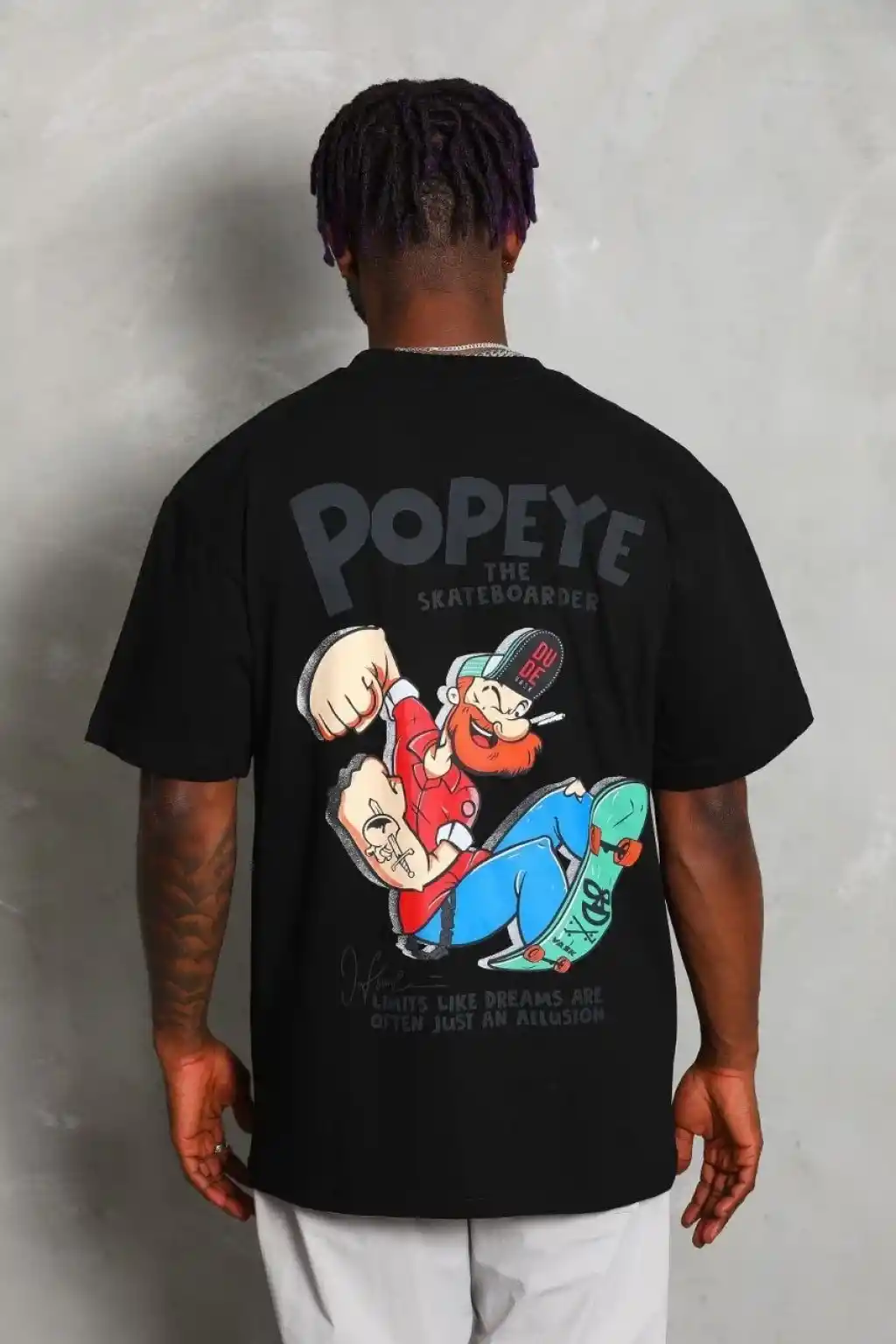 Benzersiz Sırt Baskılı Erkek Sokak Stili Bol Tişört - Nefes Alabilir Polyester, Makinede Yıkanabilir - Siyah