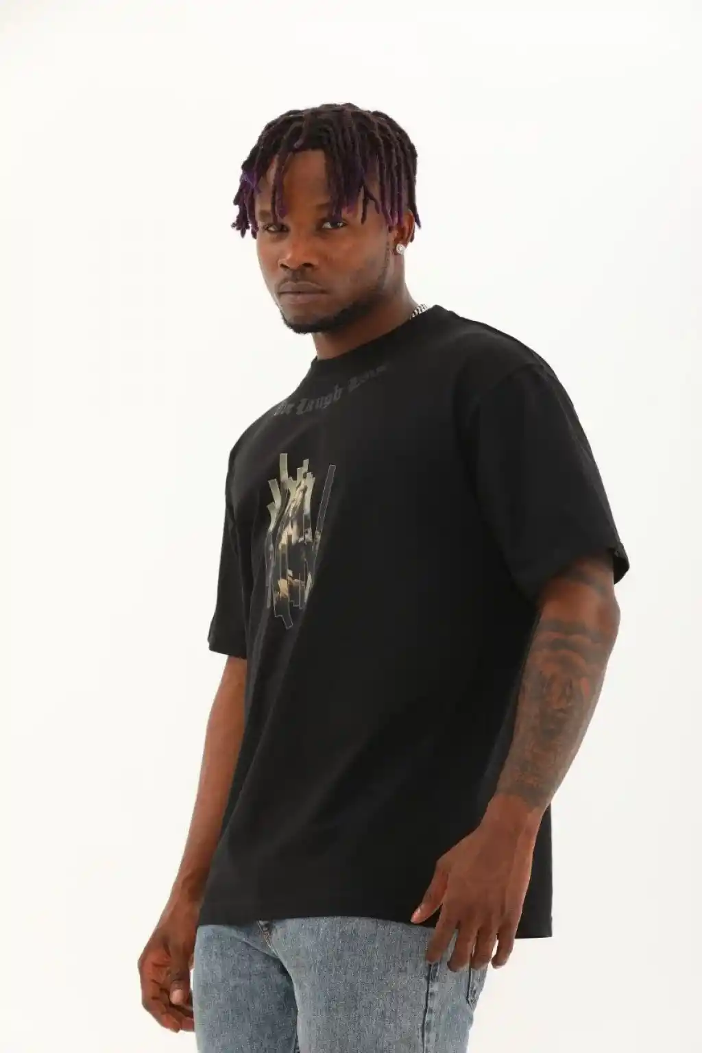 Unisex Oversize Baskılı Bisiklet Yaka T-Shirt - Siyah