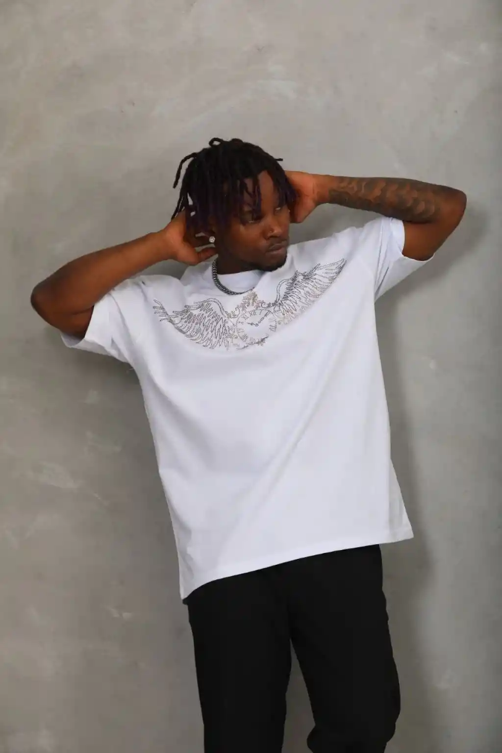 Unisex Oversize Taşlı Bisiklet Yaka T-Shirt - Beyaz