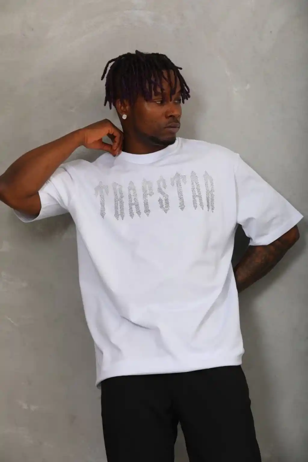 Unisex Oversize Taşlı Bisiklet Yaka T-Shirt - Beyaz