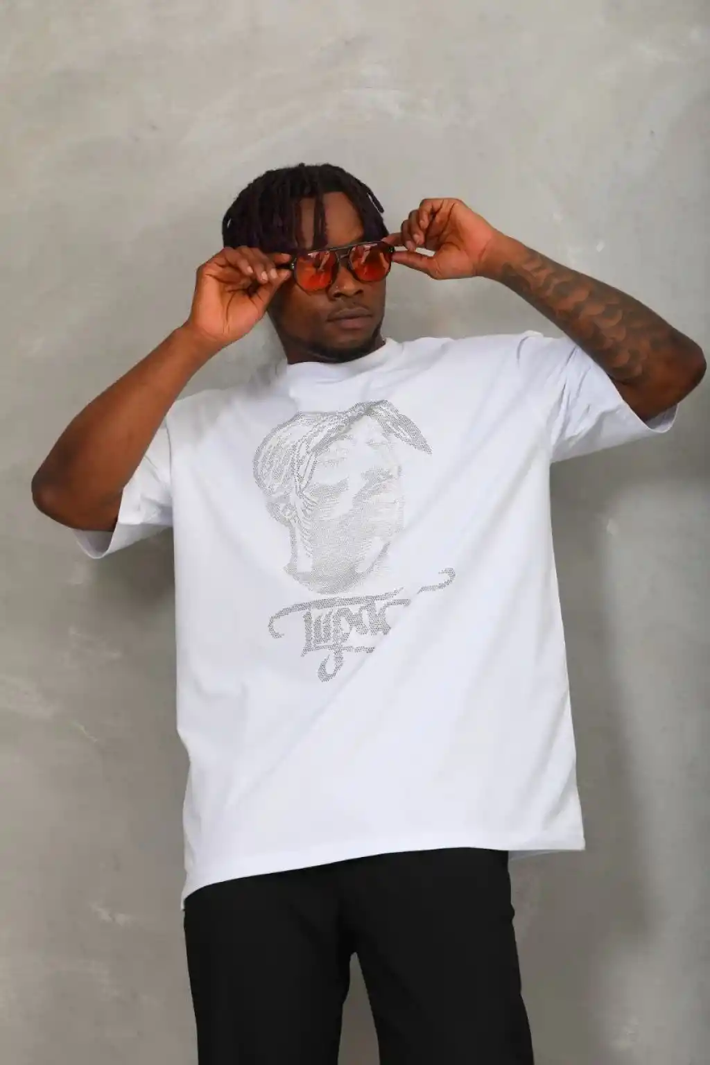 Unisex Oversize Taşlı Bisiklet Yaka T-Shirt - Beyaz