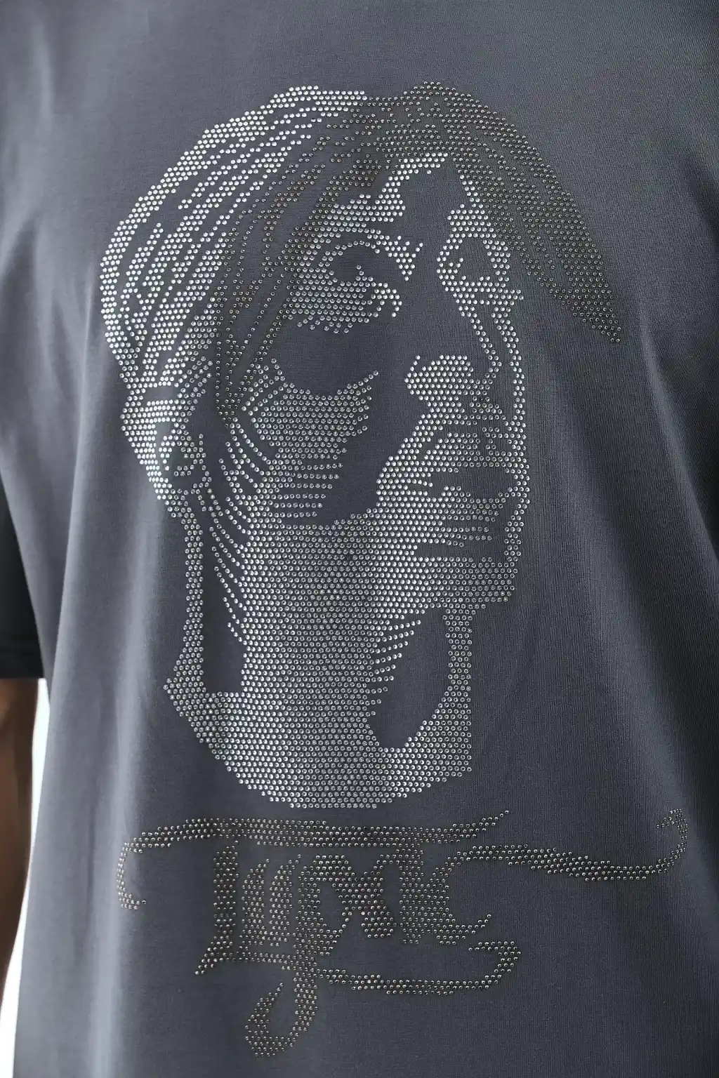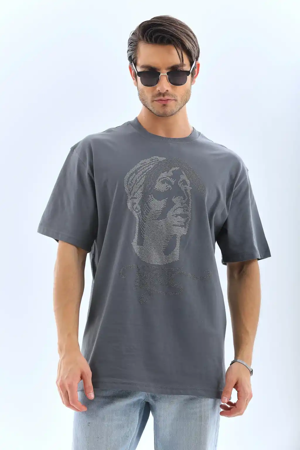 Unisex Oversize Taşlı Bisiklet Yaka T-Shirt - Füme