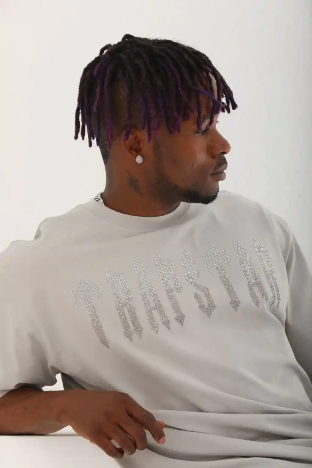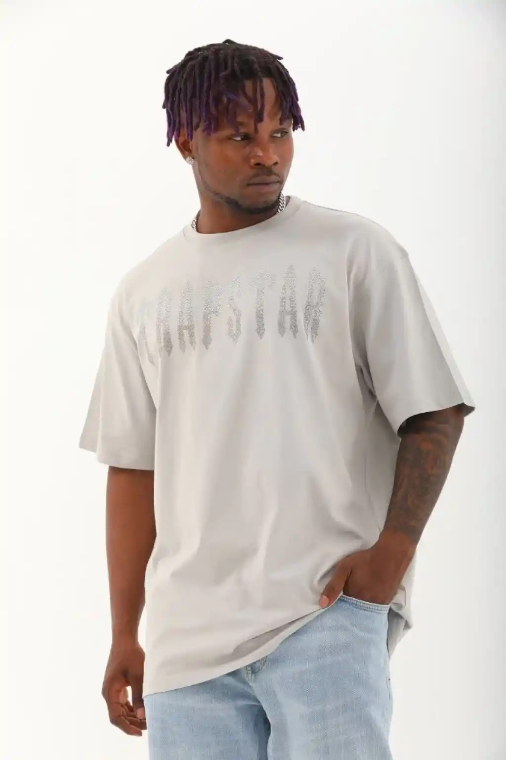 Unisex Oversize Taşlı Bisiklet Yaka T-Shirt - Gri