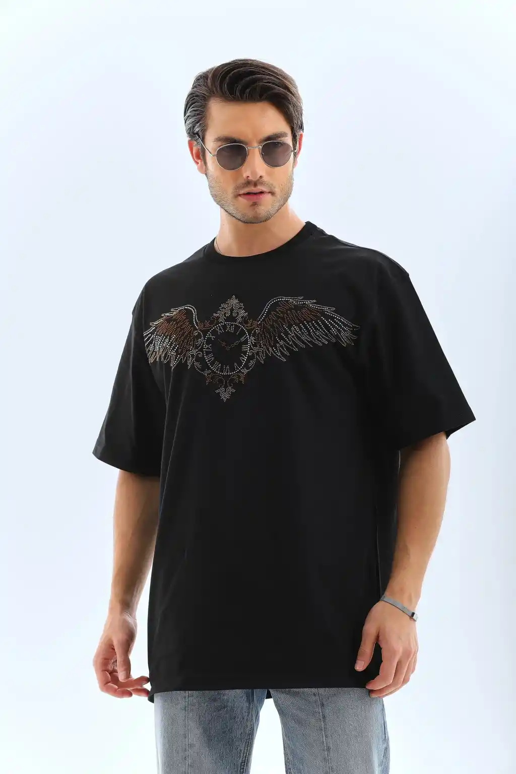 Unisex Oversize Taşlı Bisiklet Yaka T-Shirt - Siyah