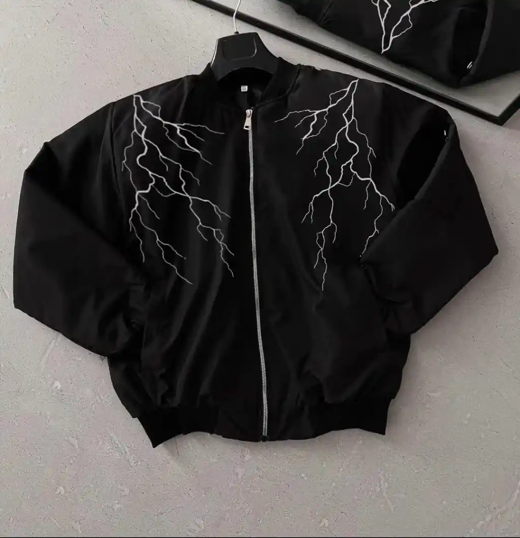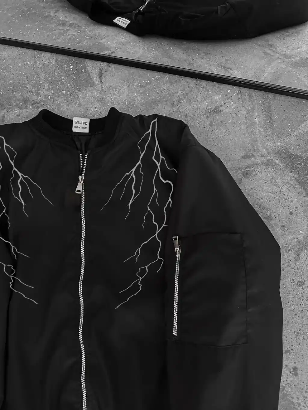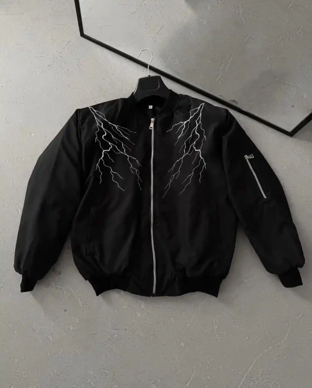 Unisex Siyah Bomber Mont – Beyaz Şimşek Desenli, Fermuarlı Cepli, Kapitone Astarlı Sokak Stili Günlük Ceket - Siyah