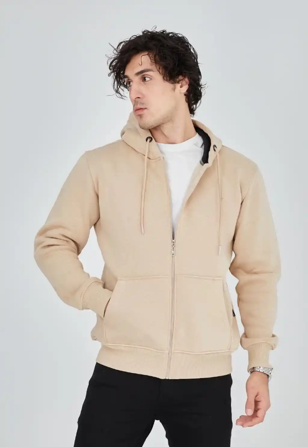 Unisex Tam Fermuarlı Kapşonlu  SweatShirt - Bej