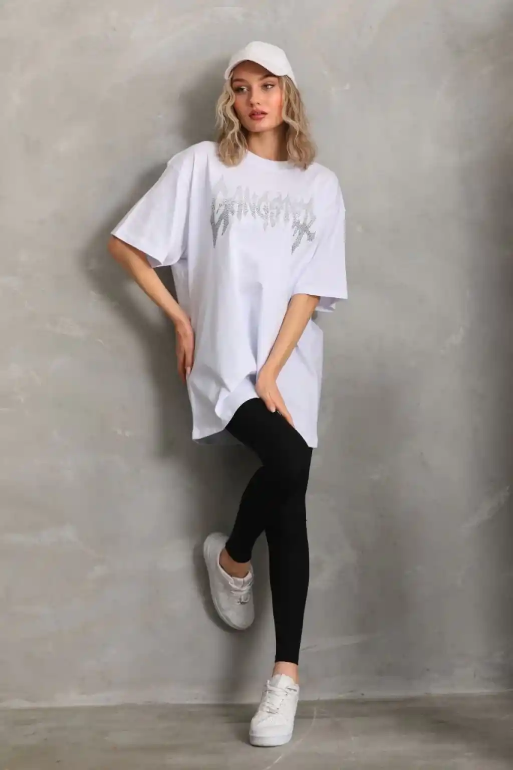 Unisex Taş Desenli Oversize T-Shirt - Beyaz