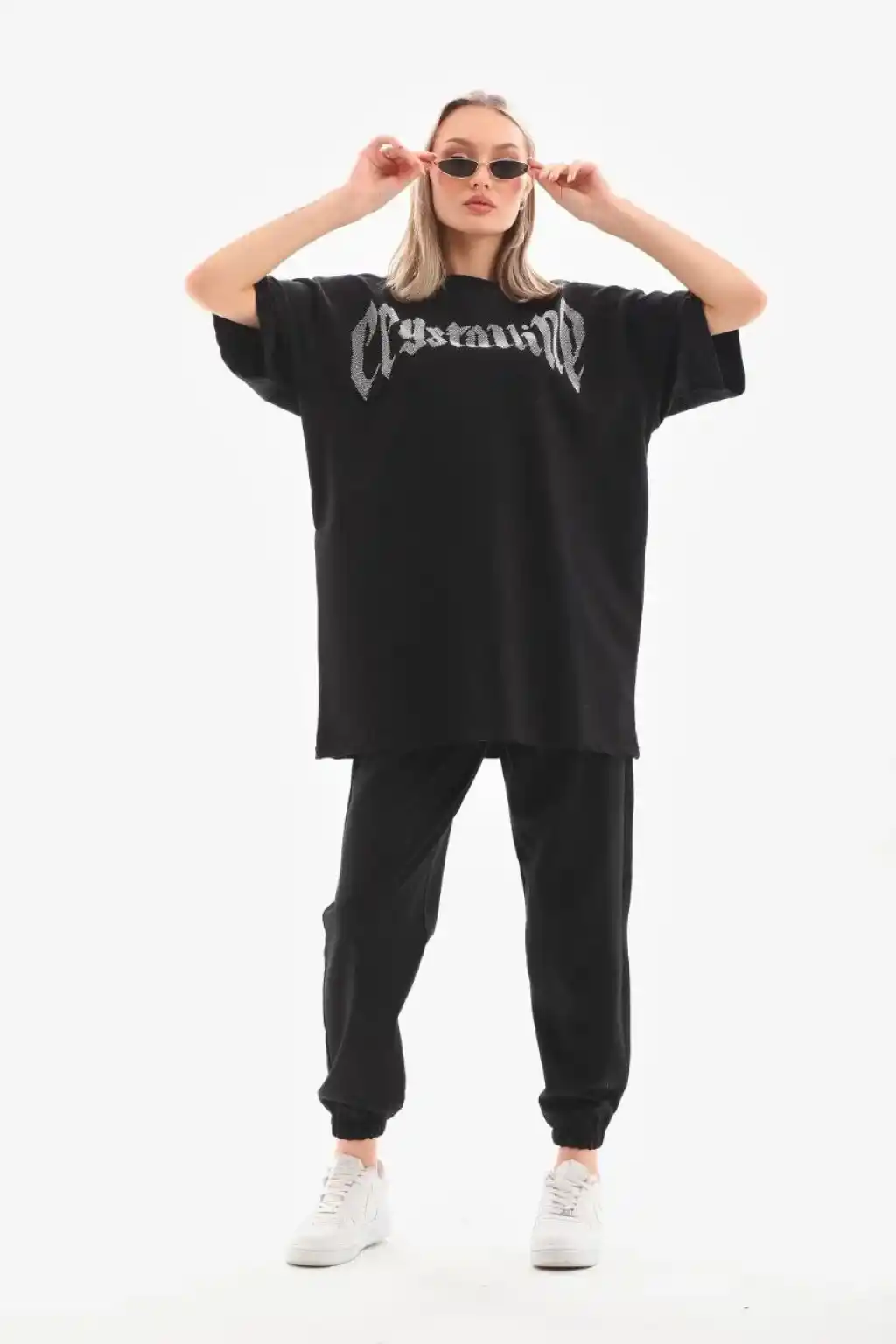 AICG Ön Arka Baskılı Bisiklet Yaka Kadın Oversize Bisiklet Yaka T-shirt - Siyah