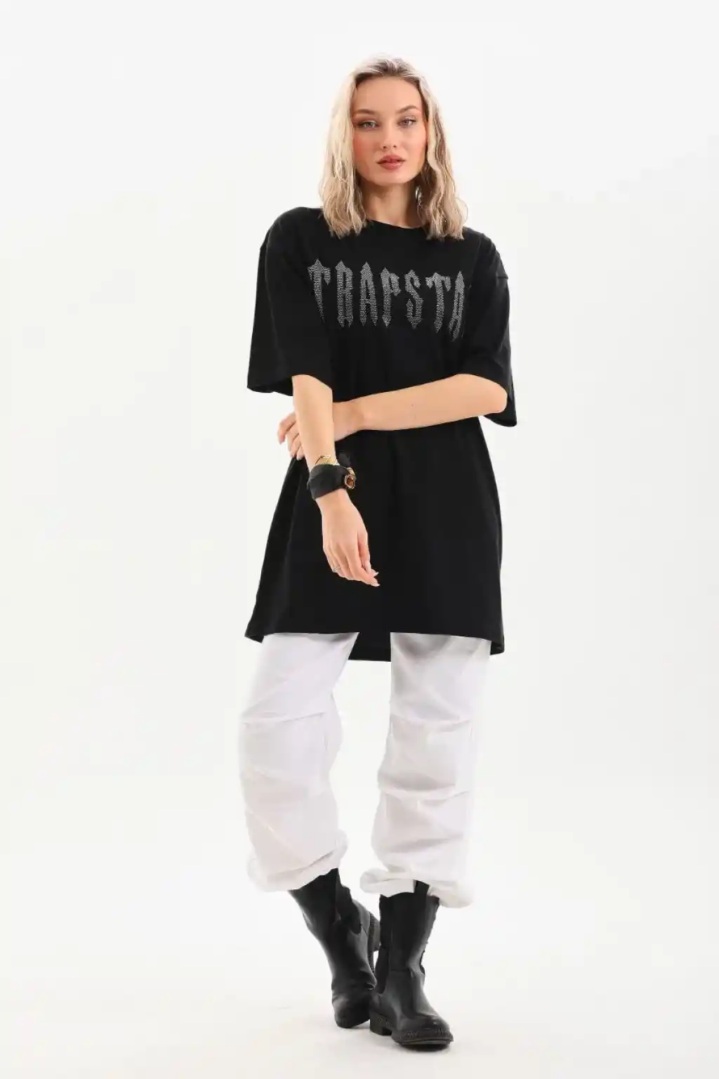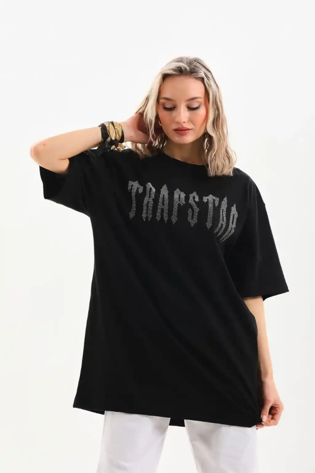 Unisex Taş Desenli Oversize T-Shirt - Siyah