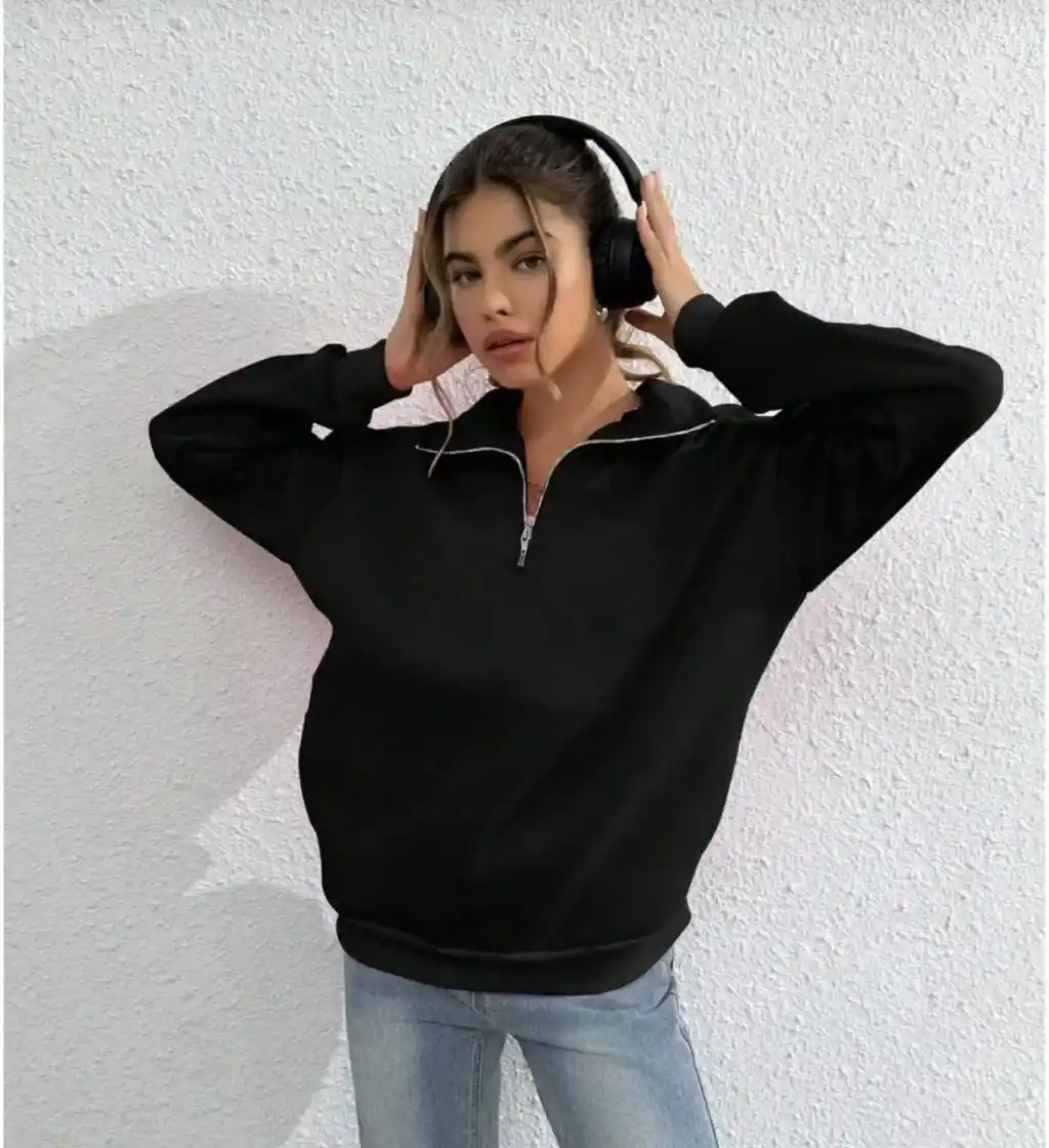Kadın Üç İplik Dık Yaka Yarım Fermuarlı SweatShirt - Siyah
