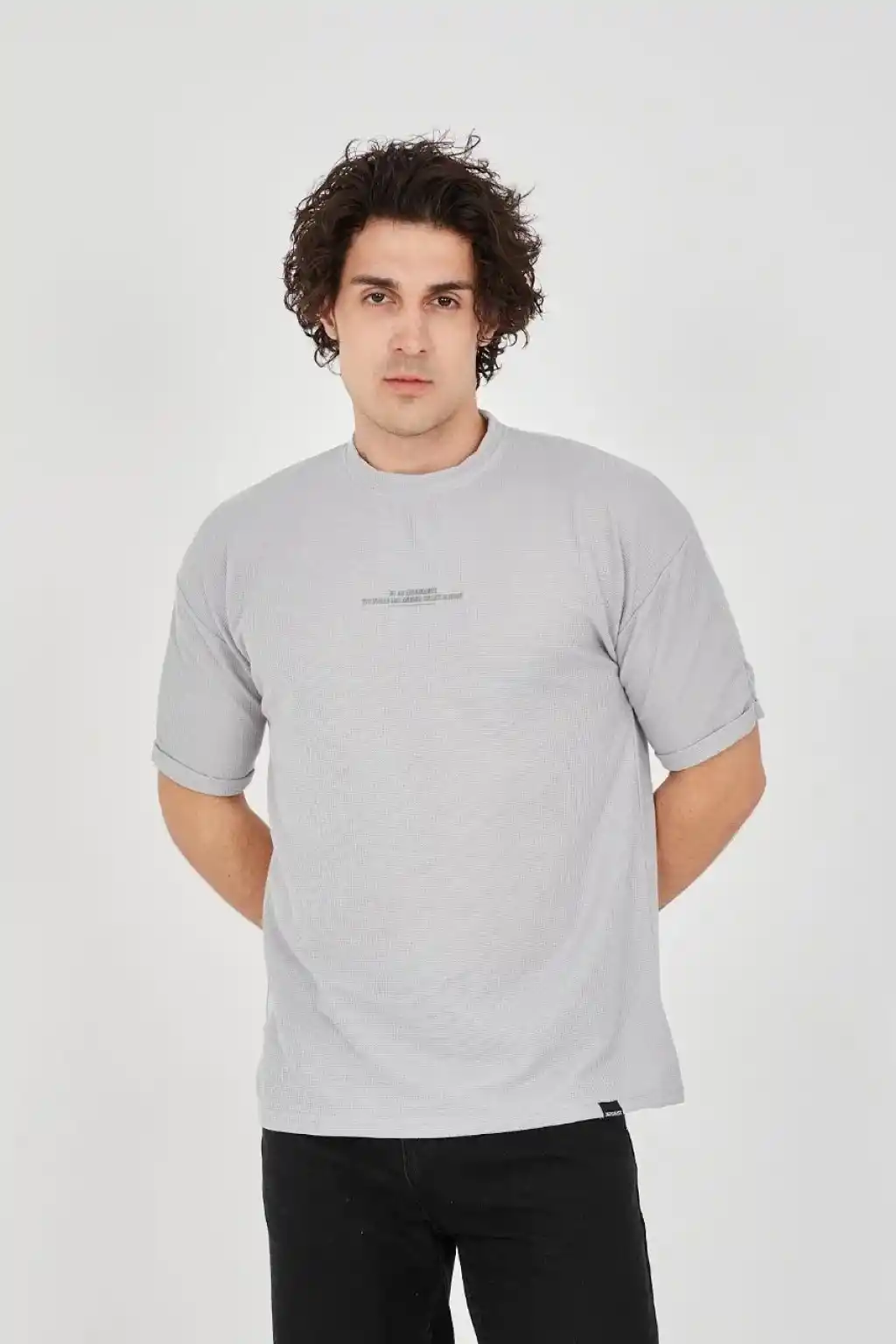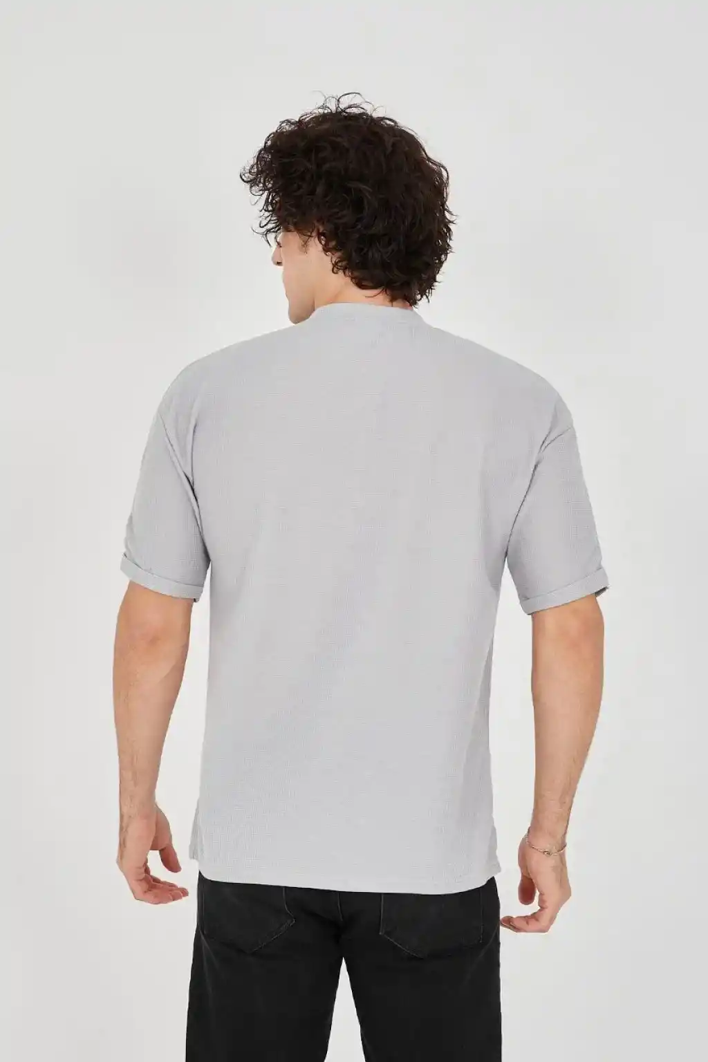 Unisex Waffle Kumaş Rahat Kol T-Shirt - Boyalı Gri
