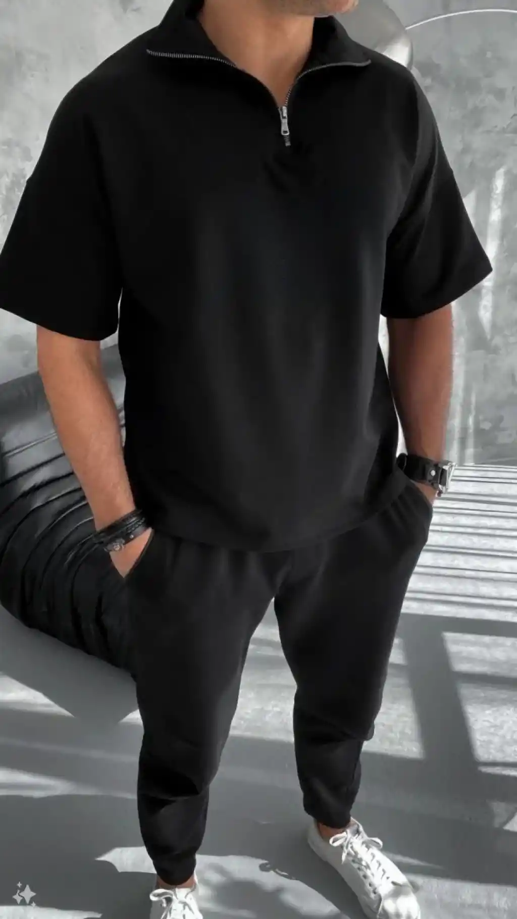 Unisex Yarım Fermuarlı Basic T-Shirt - Siyah