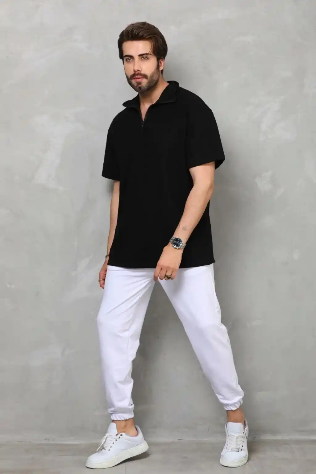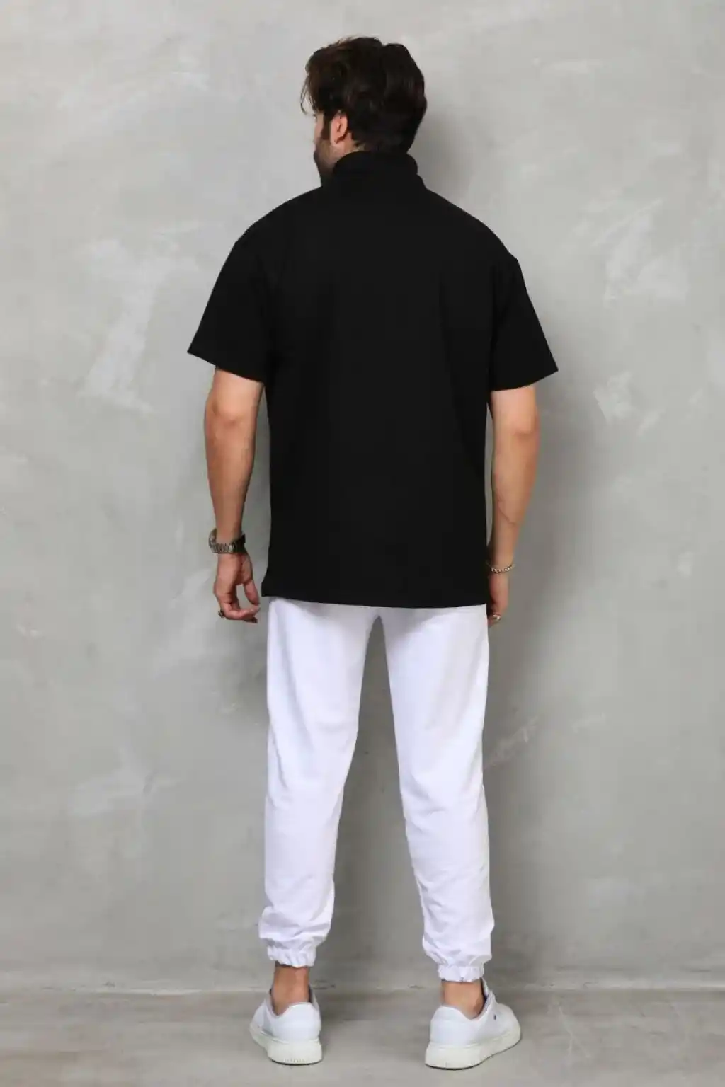 Unisex Yarım Fermuarlı Düz Oversize T-shirt - Siyah