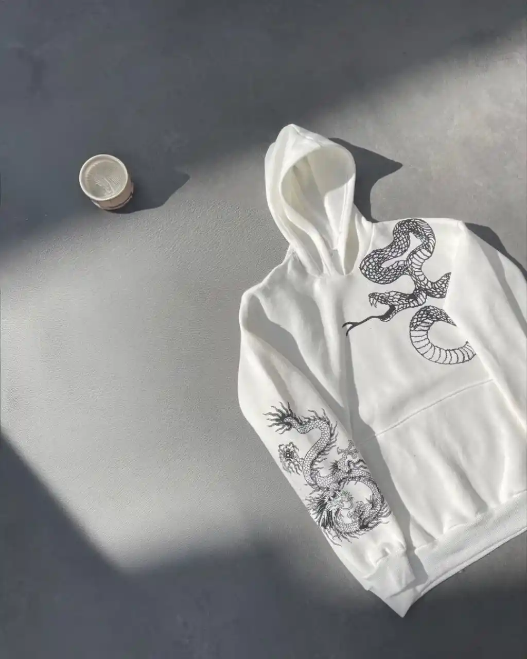 Erkek Oversize Kapüşonlu Sweatshirt – Beyaz Renk Üç İplik İçi Pamuklu Kanguru Cepli Baskılı Hoodie Rahat Kalıp Kışlık Günlük Kombinlere Uygun - Beyaz