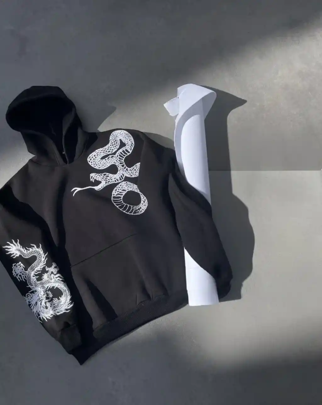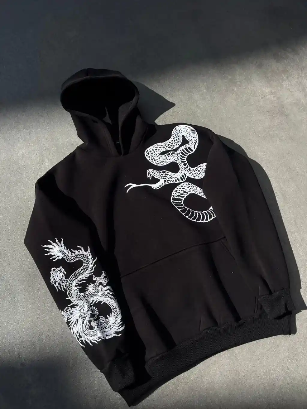 Uzun Kol Kapüşonlu Baskılı SweatShirt - Siyah