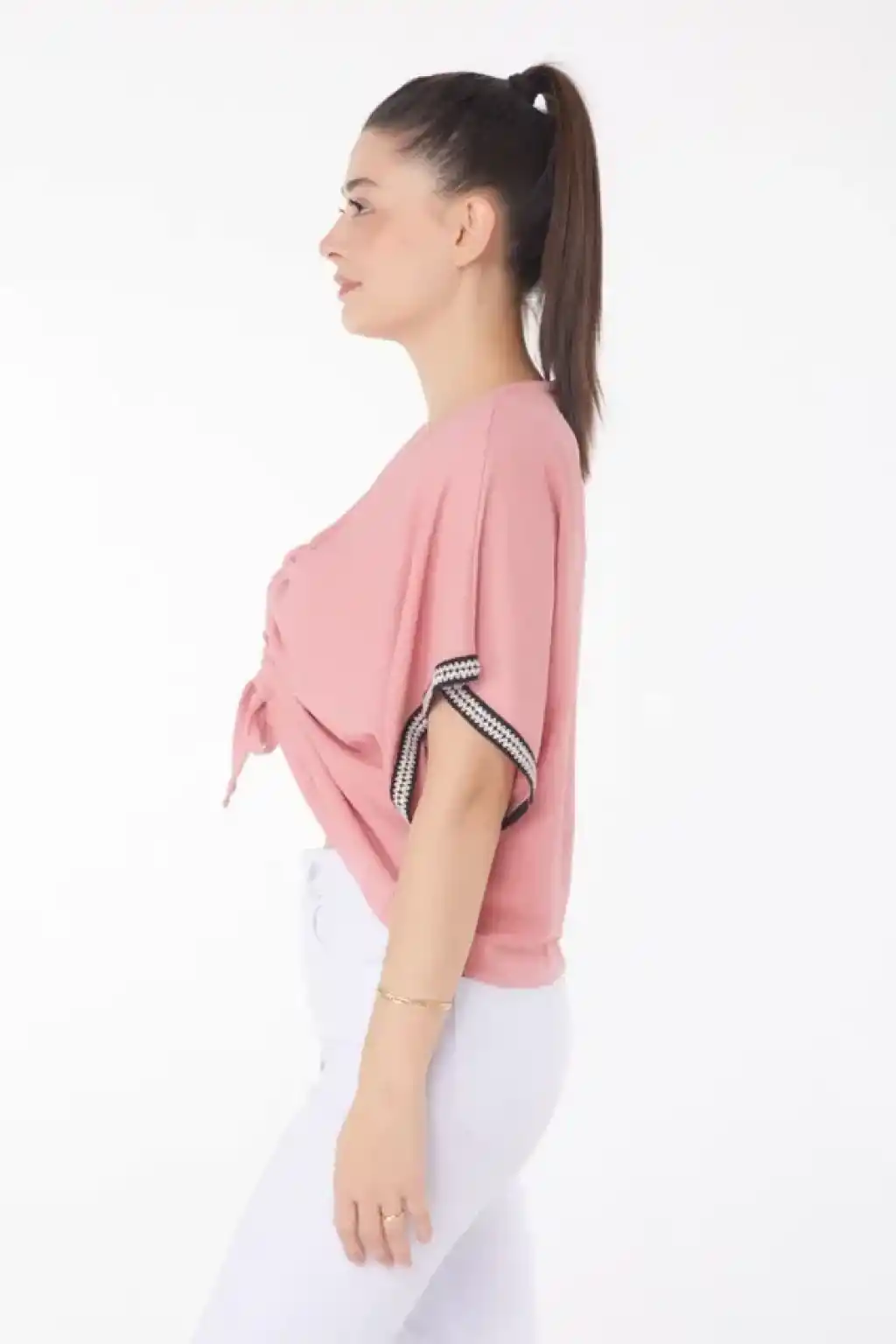 KAZAX markasının şıklığı ve rahatlığı bir araya getiren V yaka büzgülü detaylı bluz, gardırobunuzun vazgeçilmezi olmaya aday.