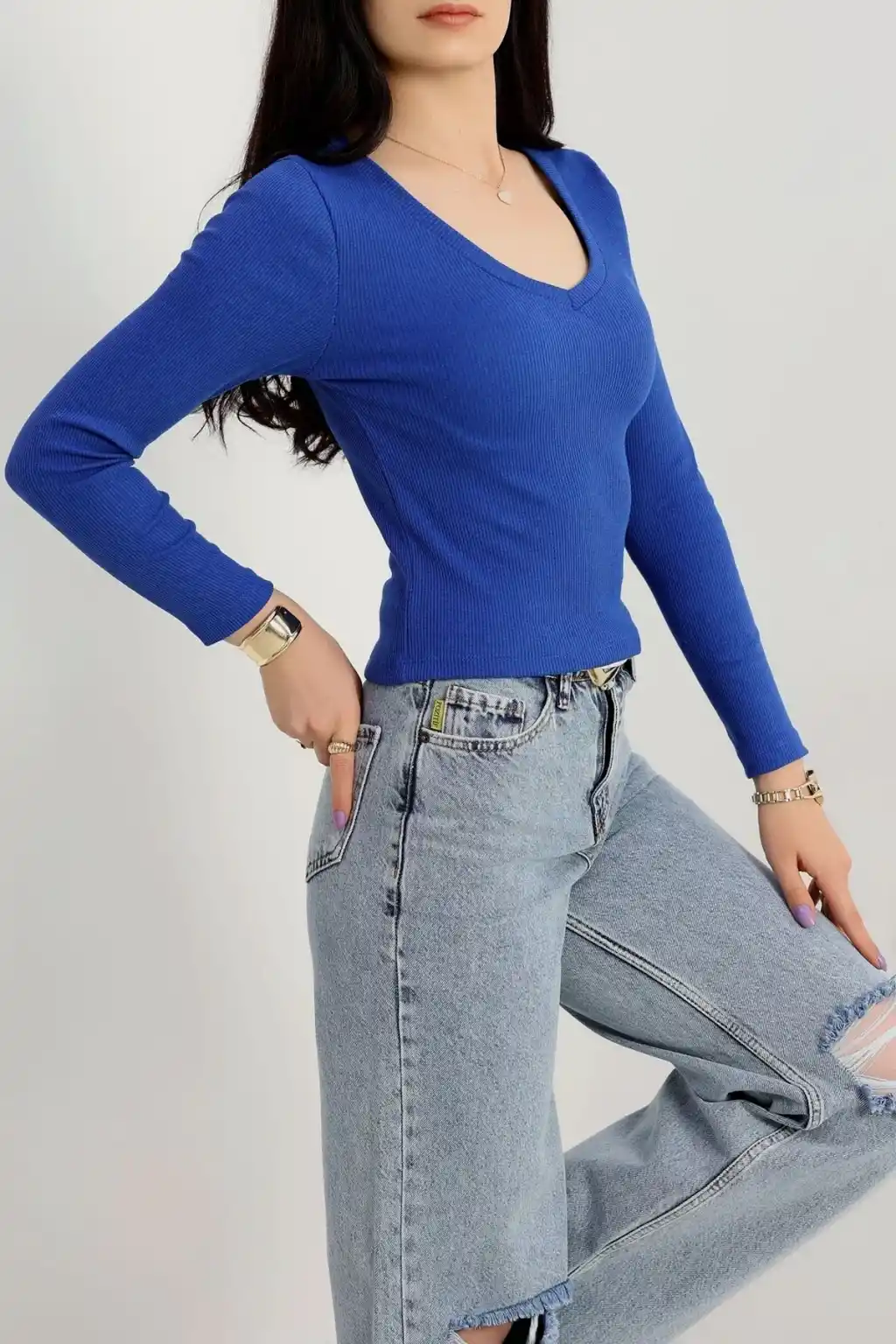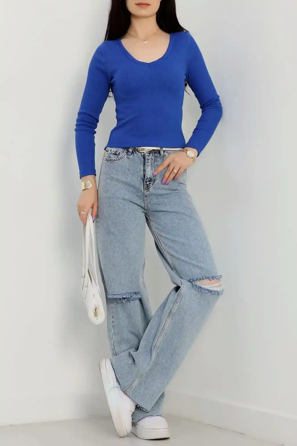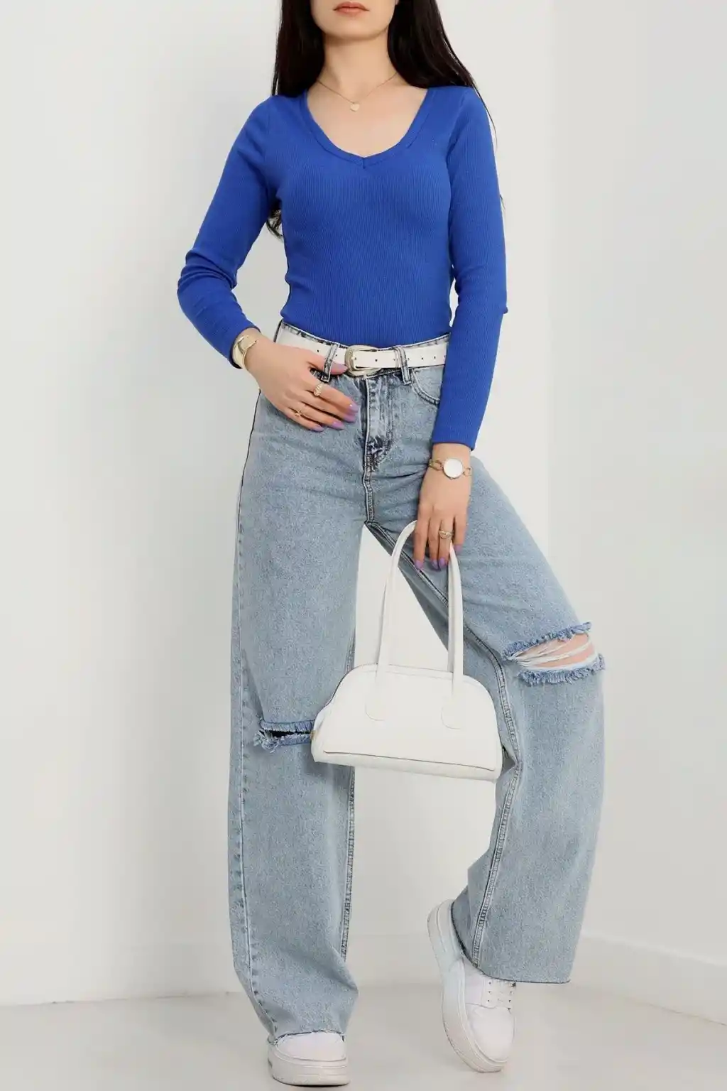 V yaka kaşkorse bluz saks mavisi a3699