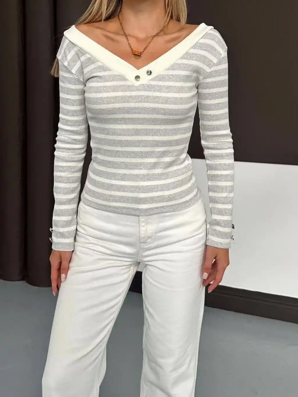 V yaka kol ve yaka düğmeli bluz gribeyaz A4047