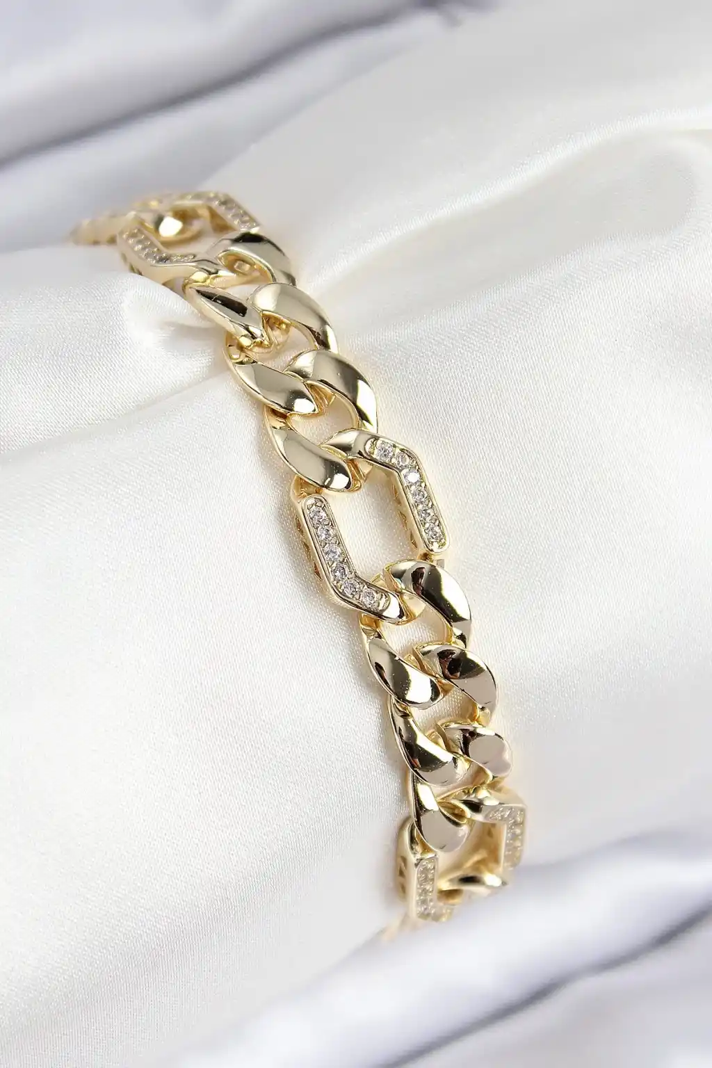 VIP Pirinç Zirkon Taşlı Parçalı Zincir Model Gold Renk Kadın Bileklik