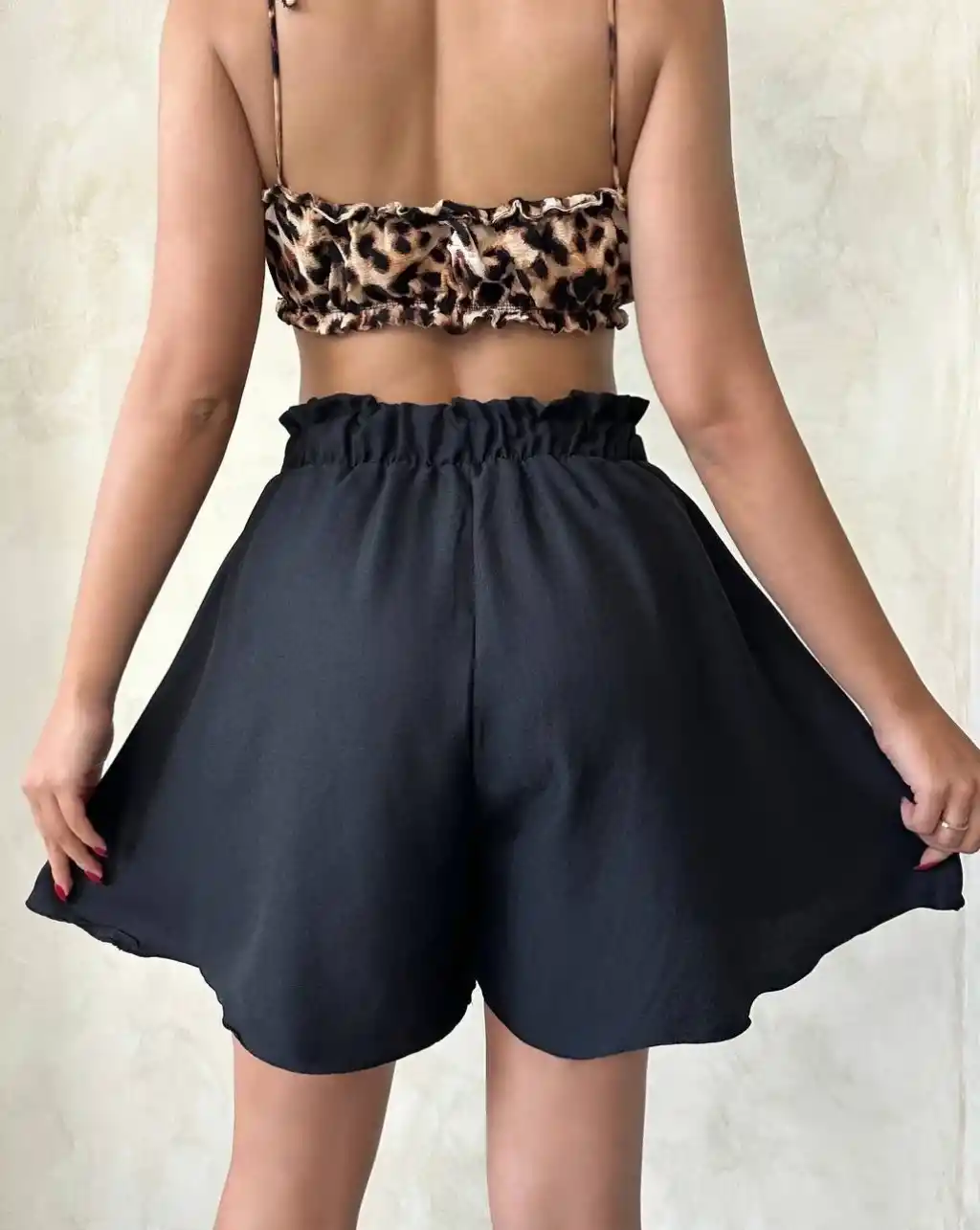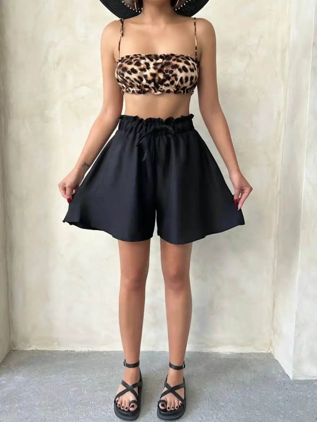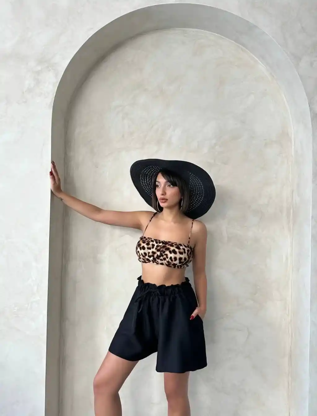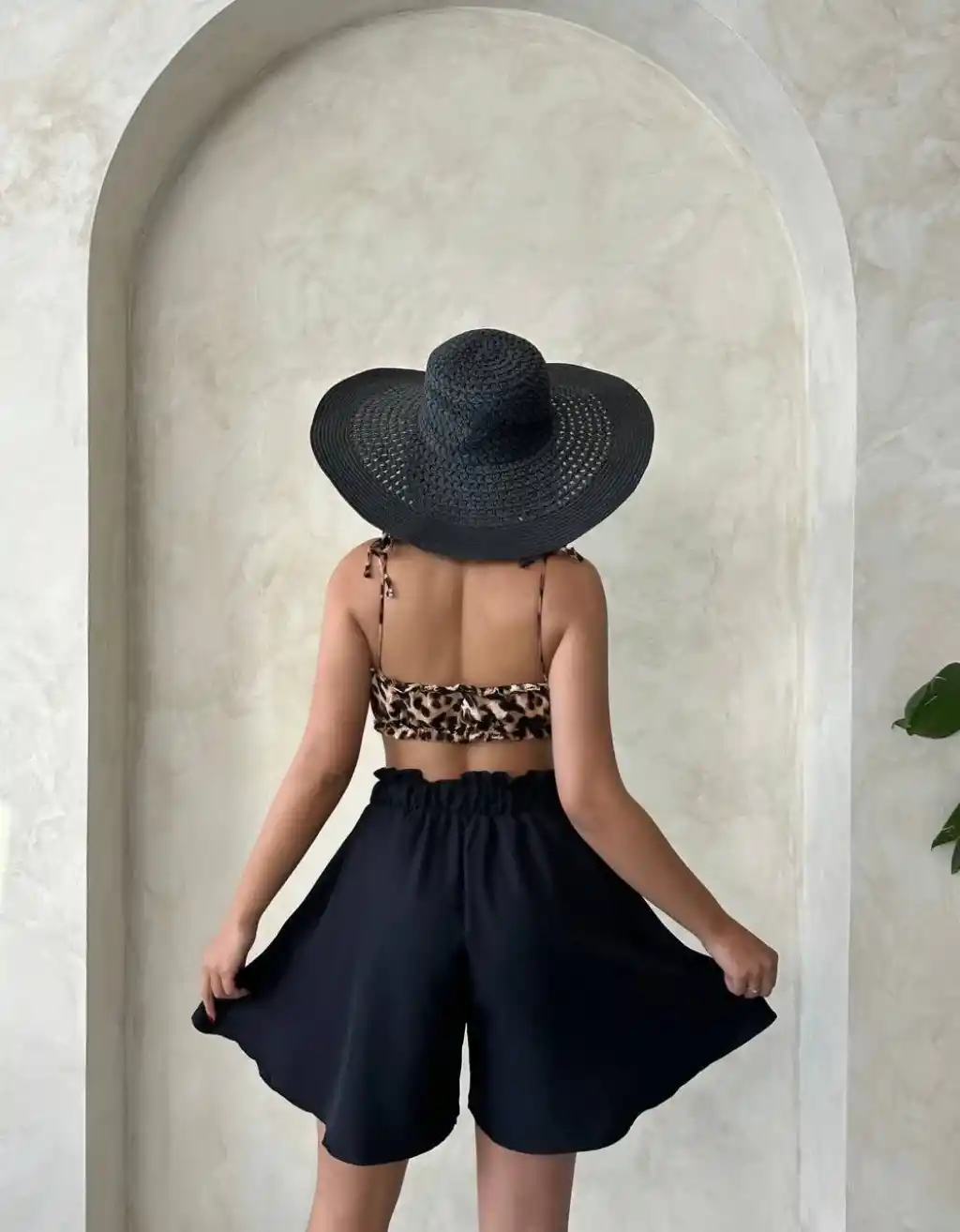Omuz kısmında yer alan volan detayı ise şortu farklı kılarak tarzını ön plana çıkarır.