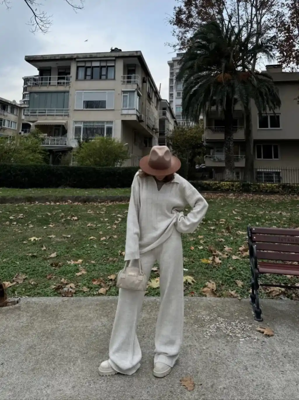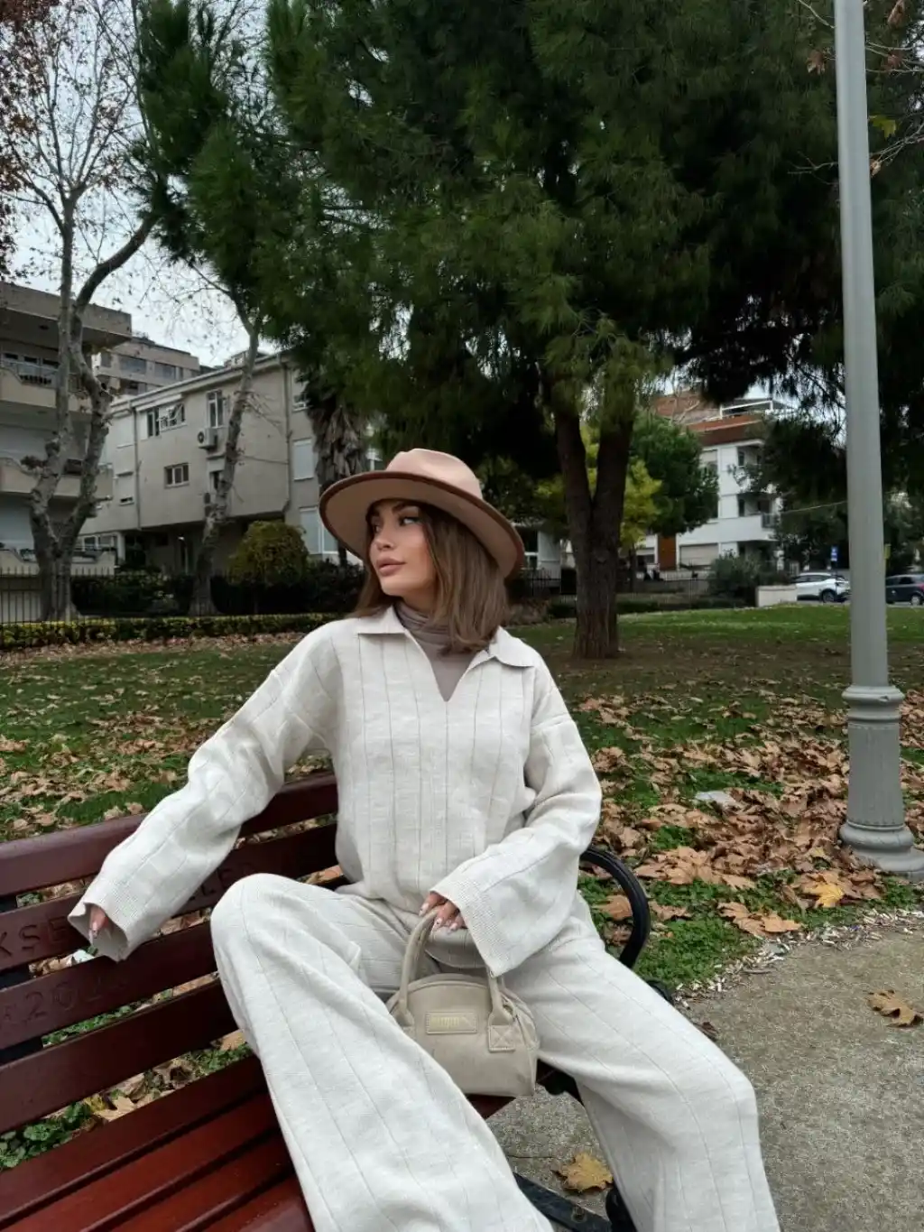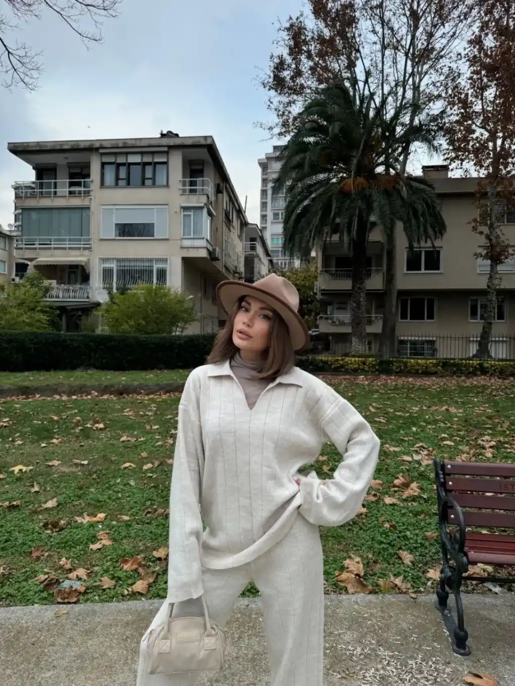 Yakalı Cizgi Detaylı Triko İkili Takım - Beyaz