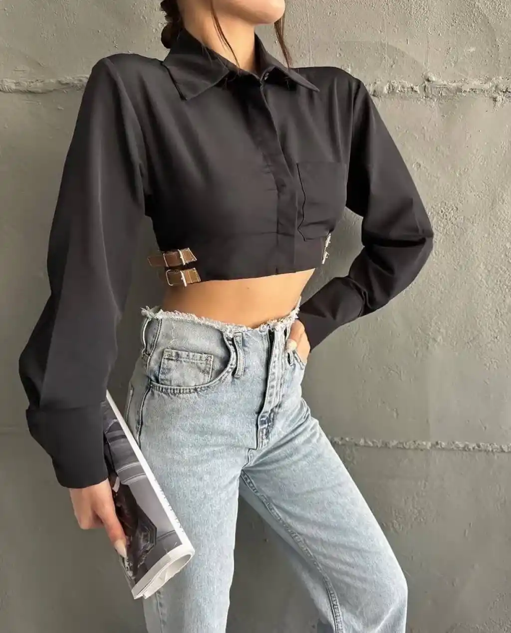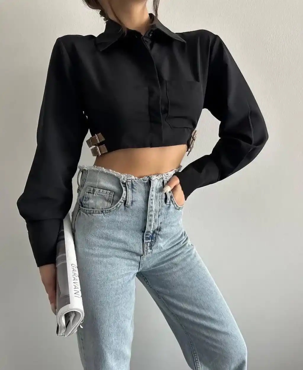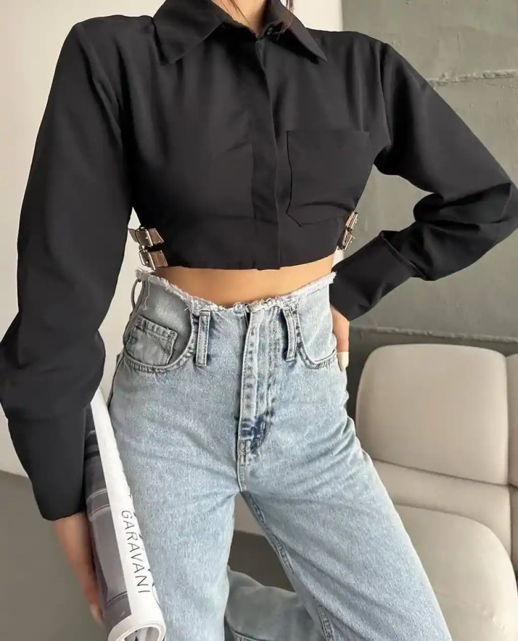 Yanı Kemer Detaylı Crop Gömlek Siyah S4009 ile tarzınızı tamamlayın! Bu crop gömlek, şıklığı ve rahatlığı bir arada sunar.