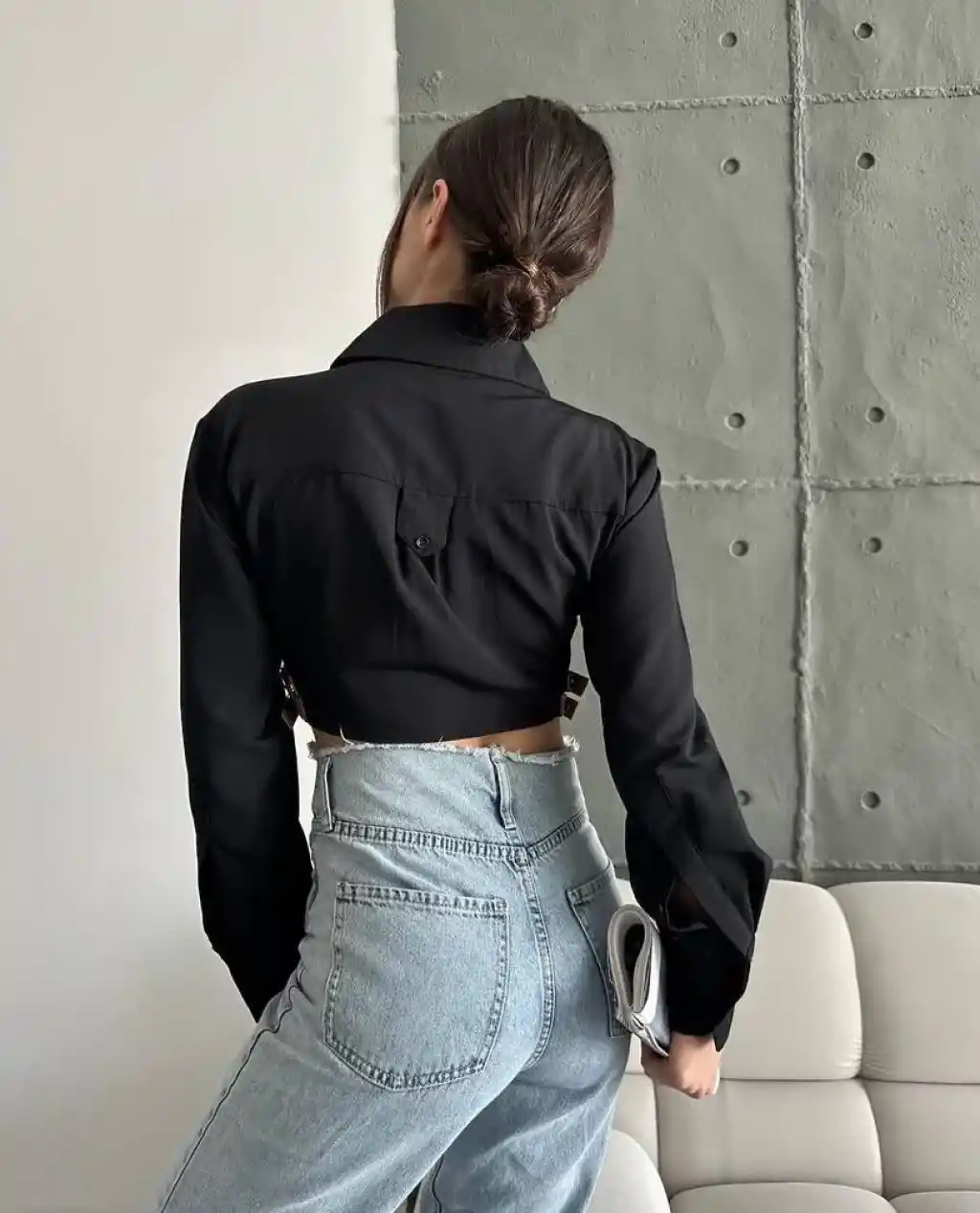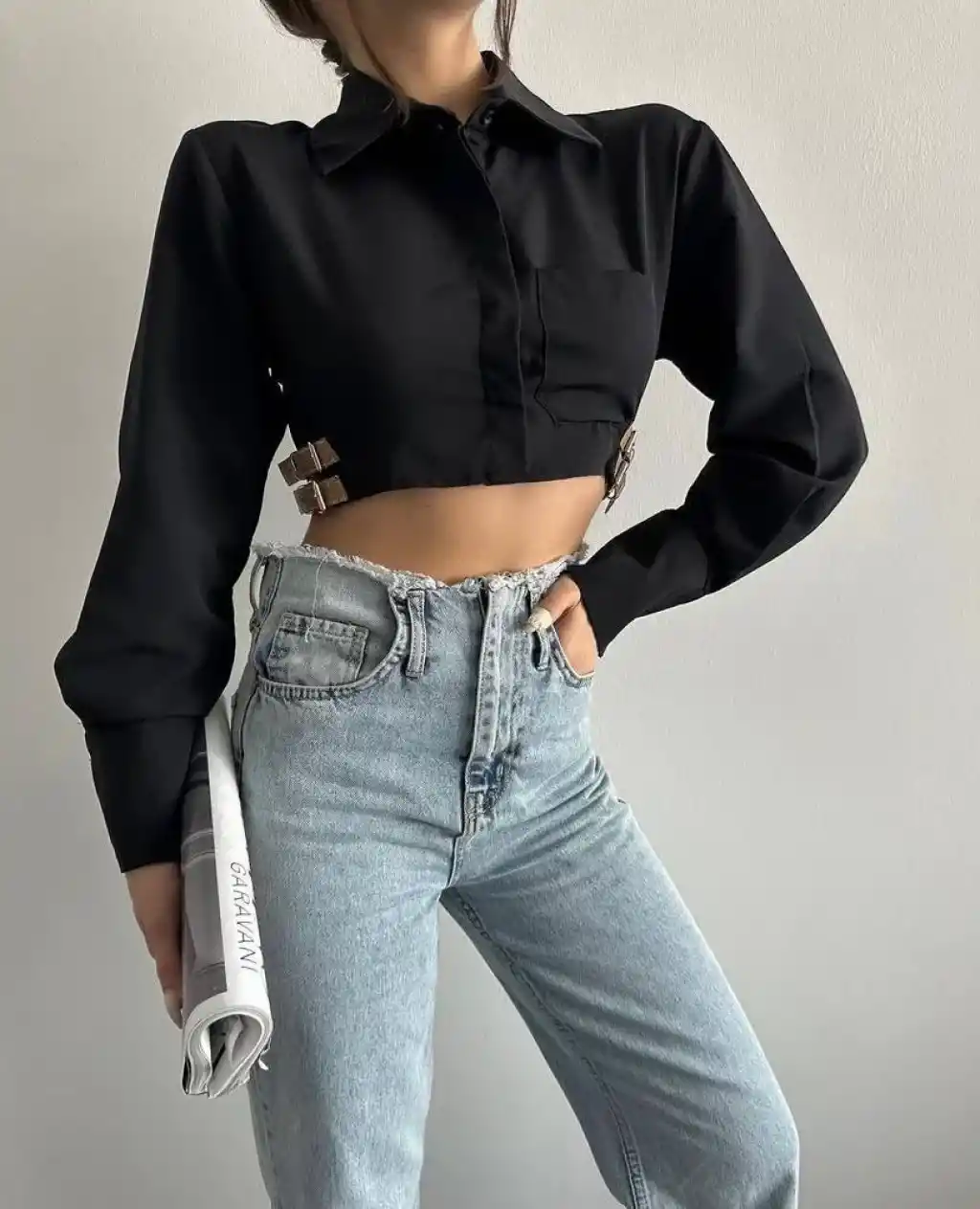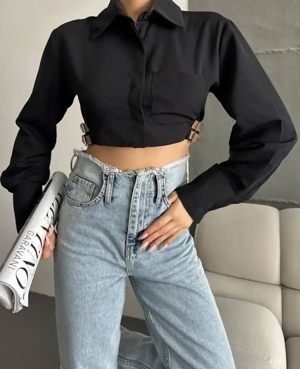 Yanı Kemer Detaylı Crop Gömlek Siyah S4009 ile tarzınızı tamamlayın! Bu crop gömlek, şıklığı ve rahatlığı bir arada sunar.