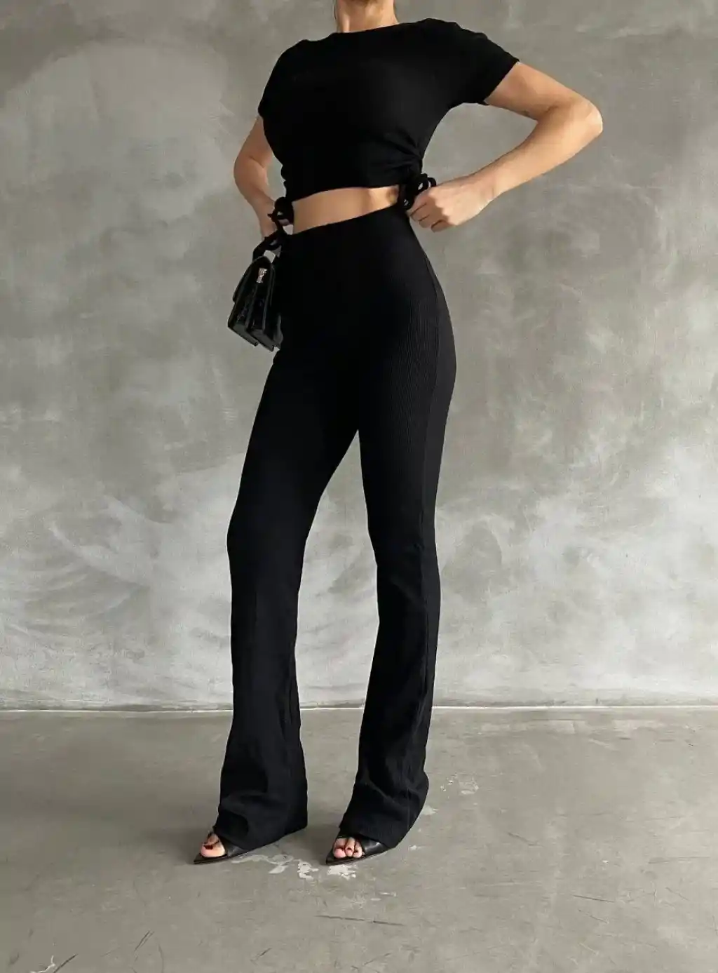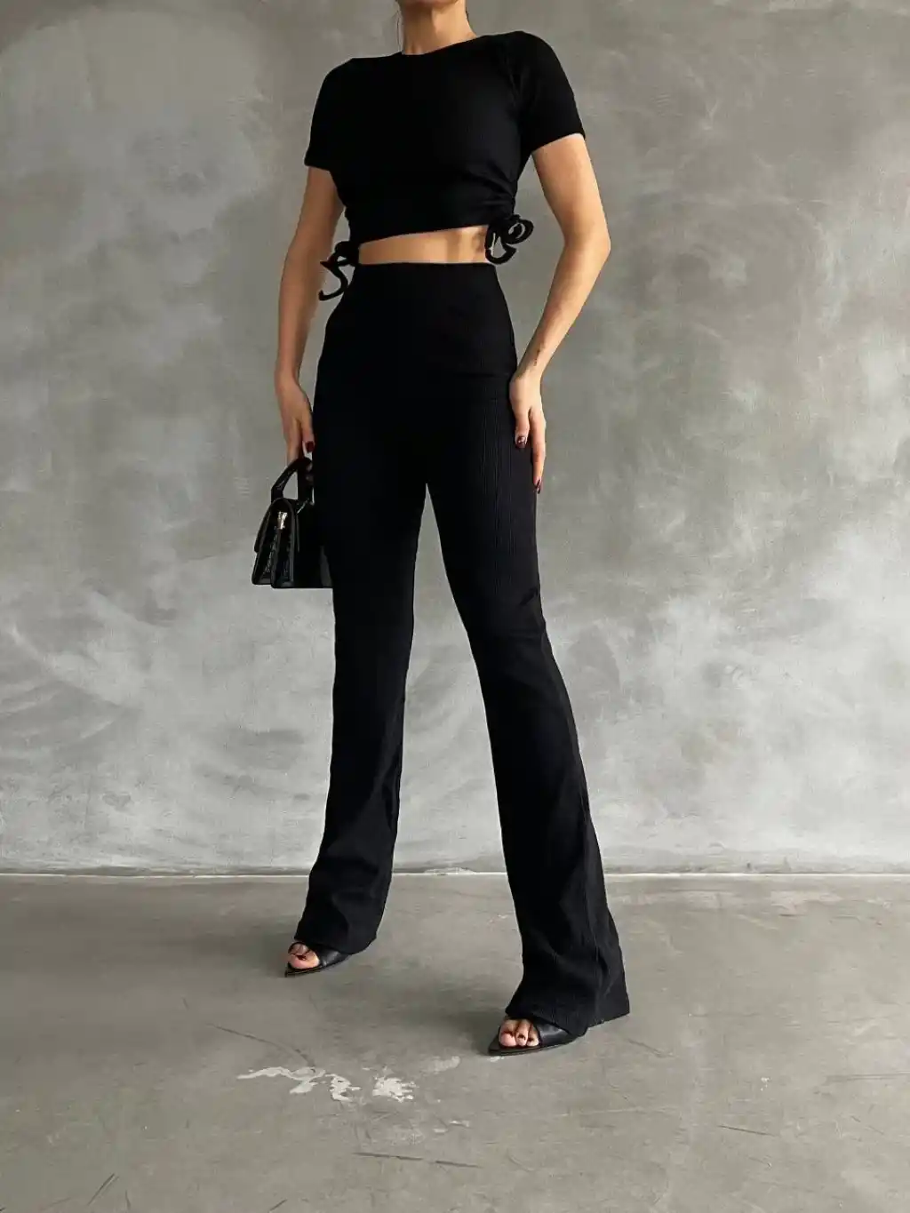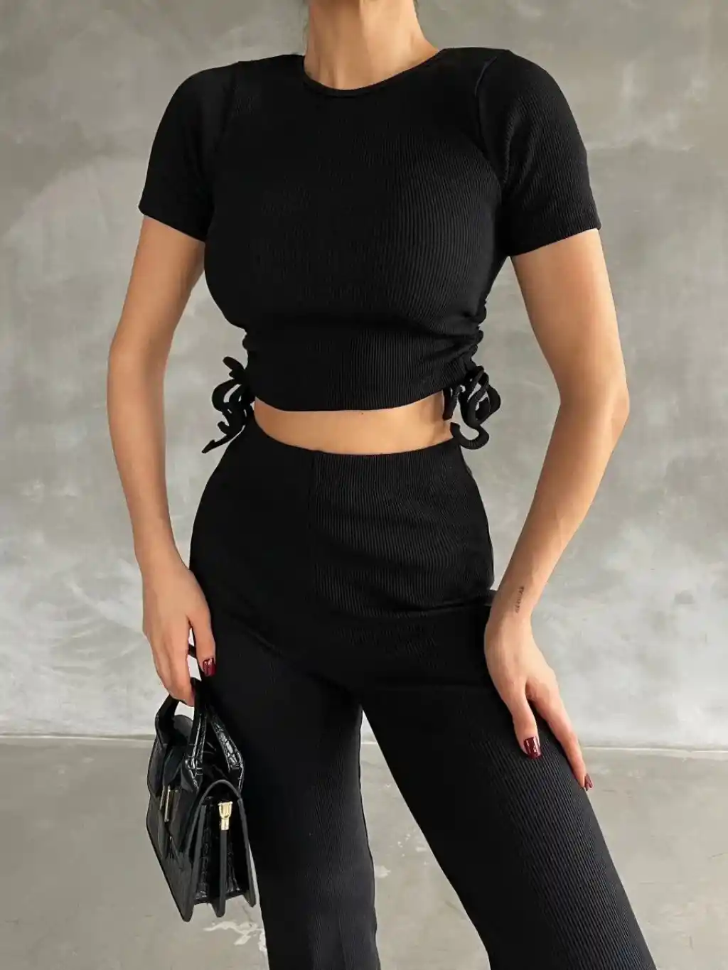 • Yanları tünel detaylı pantolonu, uyumlu bluzu ile kombin tamamlar.