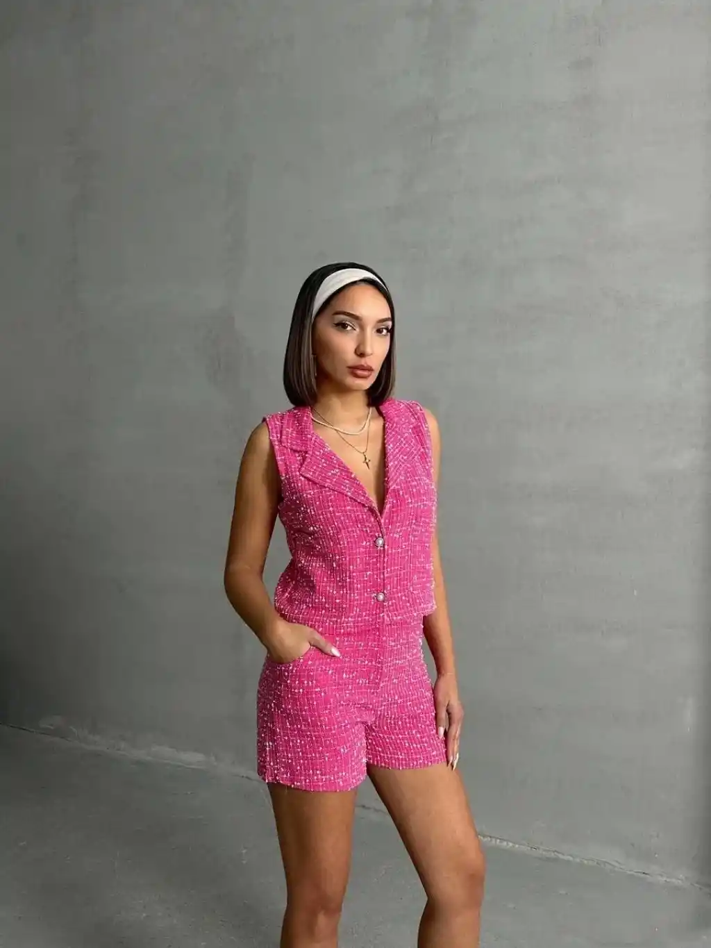 - Pembe renkli yeleğiyle dikkat çeken şort takım, yaz aylarının vazgeçilmezi olacak.