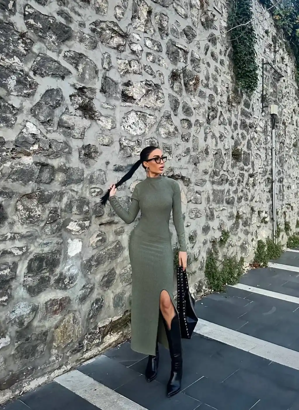 Yırtmaçlı kalın bürümcük uzun elbise Yeşil