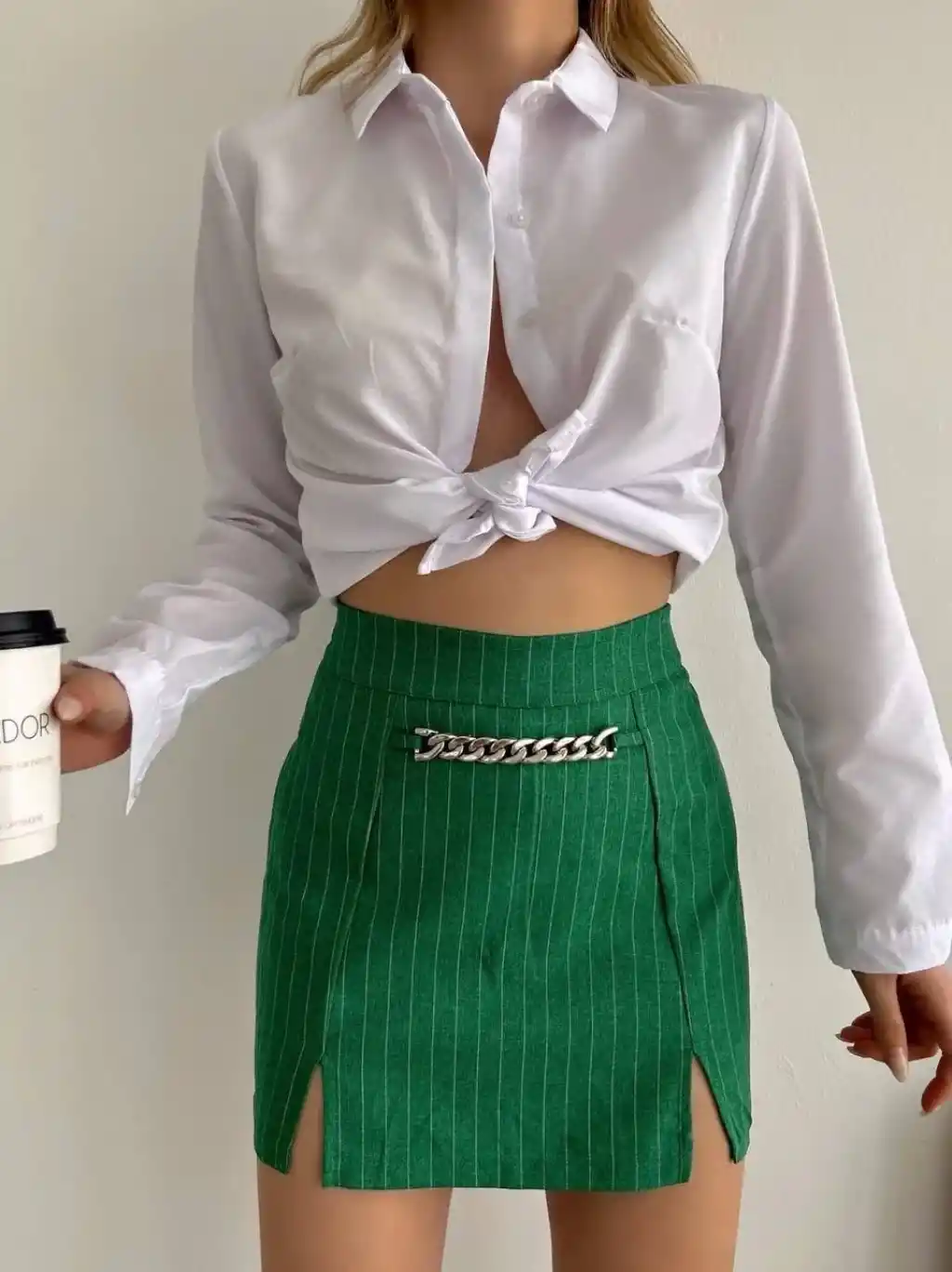 İki düğmeli kaz ayağı desen ch kumaş şort etek beyazturuncu h26414